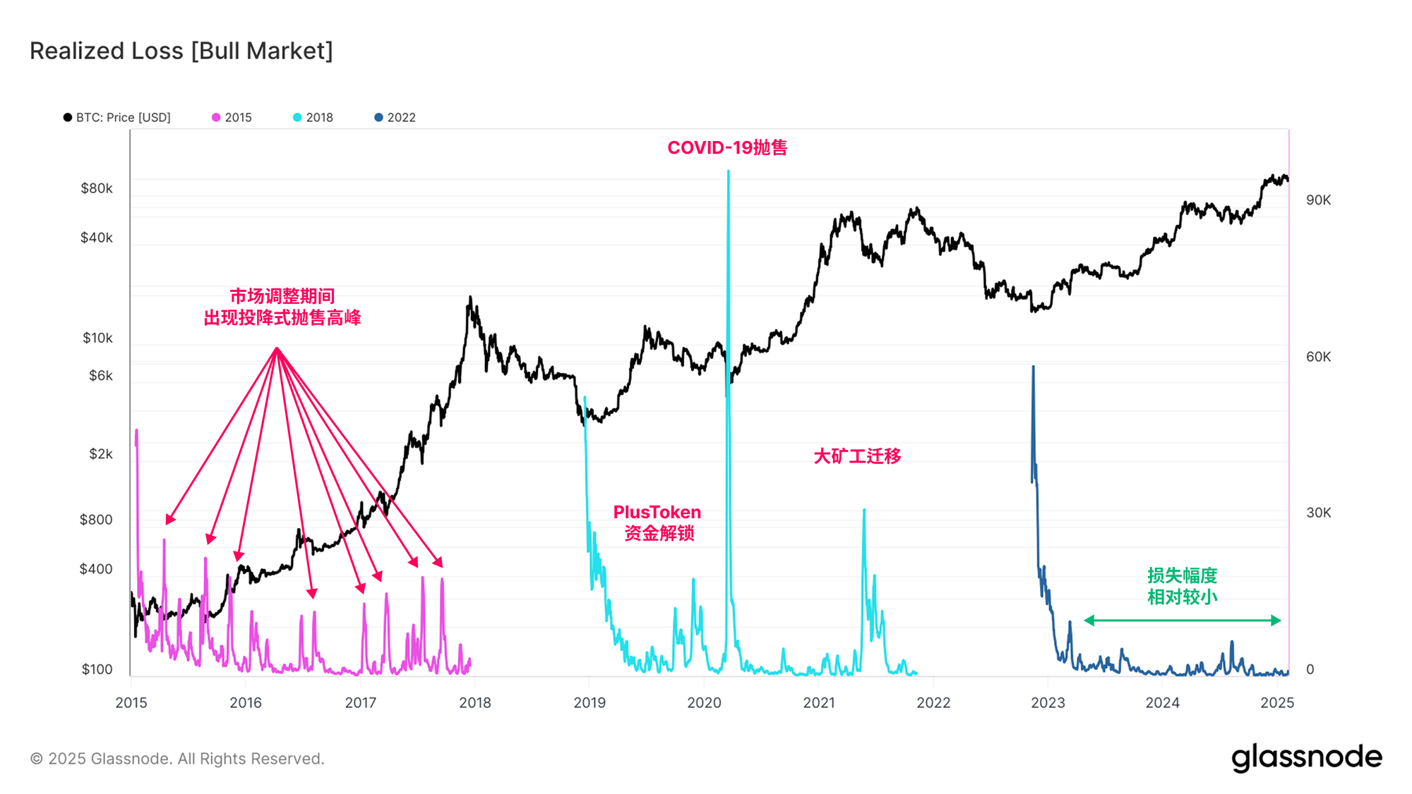 这一现象与过去周期的市场结构有明显不同,例如2015-2018年周期经历了多次局部恐慌性抛售。2019-2022 年间市场更加动荡,发生了多次深度投降事件,如2019 年中PlusToken诈骗崩盘、2020年3月COVID-19抛售潮,以及2021年中矿工大规模迁移。