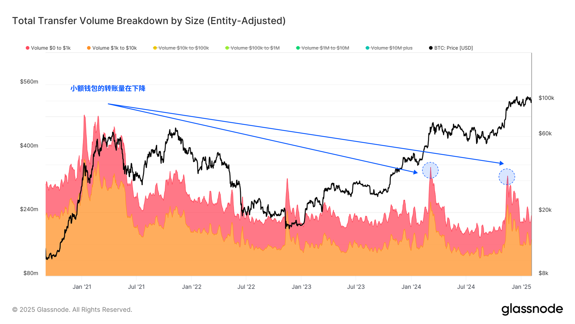 如果我们单独分析来自小额钱包(余额低于$1万美金)的转账交易量,相较于2021年历史前高水平,该指标出现了显著下降。这一趋势发生在本轮周期整体结算量大幅增加,以及比特币价格明显走高的情况下。