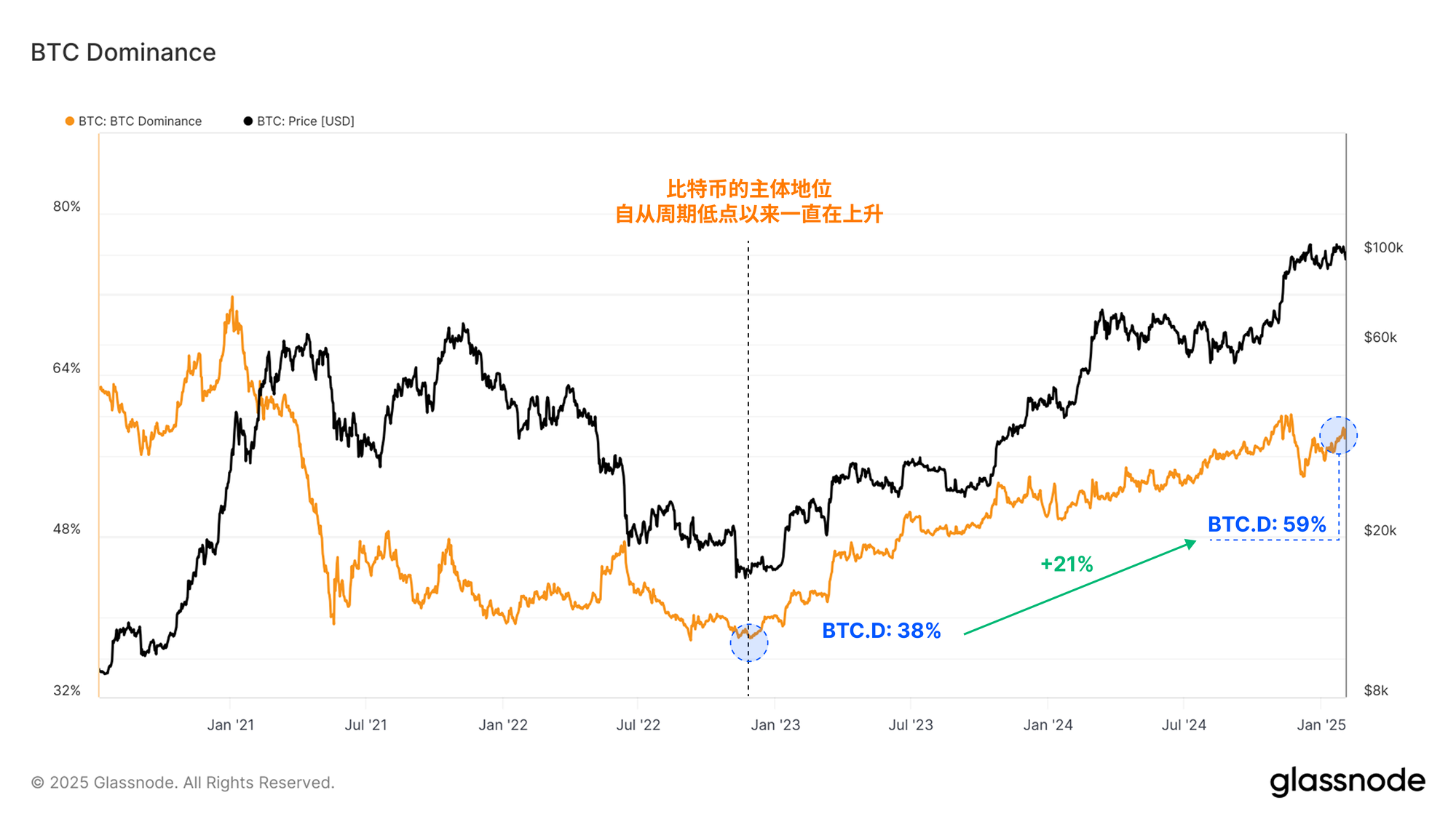自2022年11月 FTX 崩溃以来,比特币的市场占比一直处于上升趋势,从38%上升至59%。这表明在数字资产市场中,资金流动和价值积累正在优先向比特币倾斜。