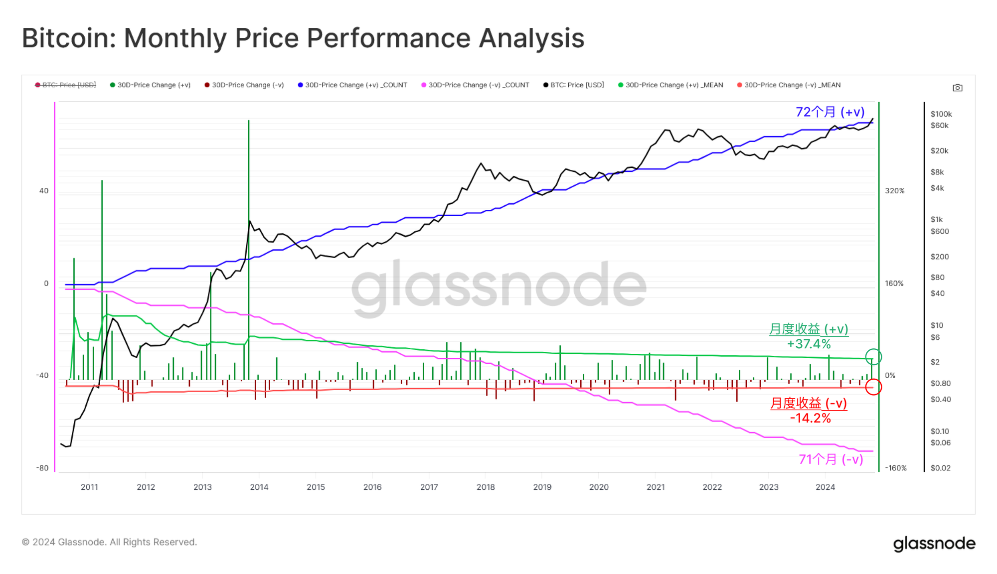 比特币的交易历史已长达5256天,价格从零点几美分一路上涨至100,000美元。这段旅程中,出现了72个月的正收益(包括2024年12月),平均涨幅为37.4%;71个月的负收益,平均跌幅为-14.2%。