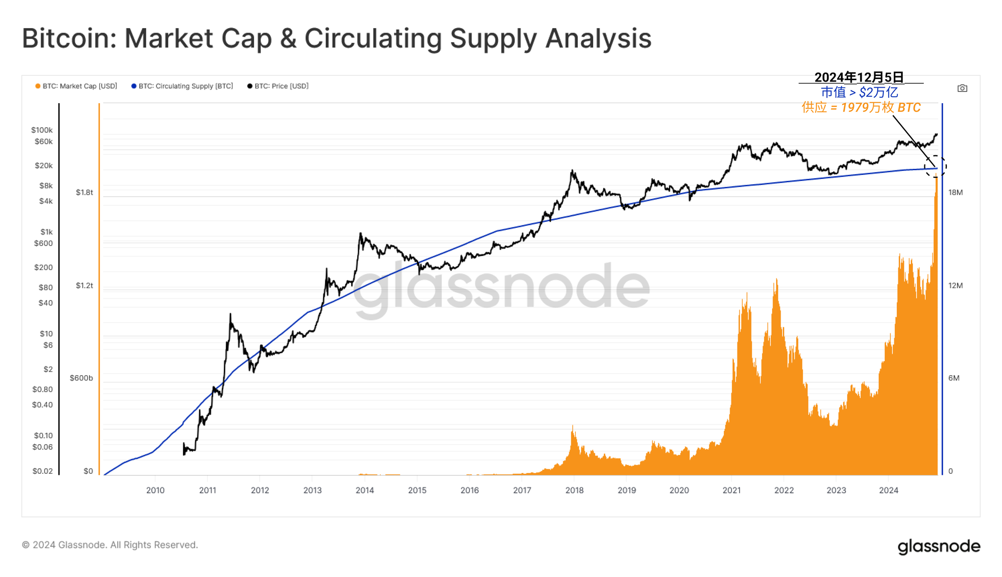 截至2024年12月5日,总计已挖掘19,791,952枚比特币,代表着最终2100万个供应上限的94.2%。比特币的市值也曾短暂突破2万亿美元,并且已经超越了贵金属白银的市值(约1.84万亿美元)。