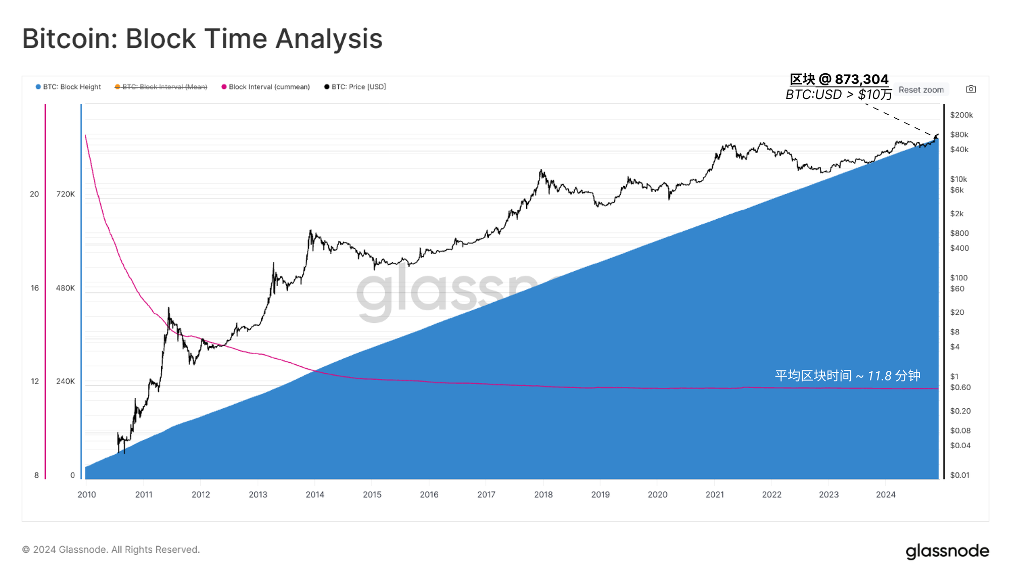 自创世区块以来,共挖掘了873,304个区块,比特币在2024年12月5日达到了历史性价格100,000美元,平均区块时间为11.8分钟。尽管由于哈希率的增加,当代的平均区块时间已缩短至约9.6分钟,但早期由于中本聪高估了笔记本电脑CPU的算力,初期的挖矿难度较大。