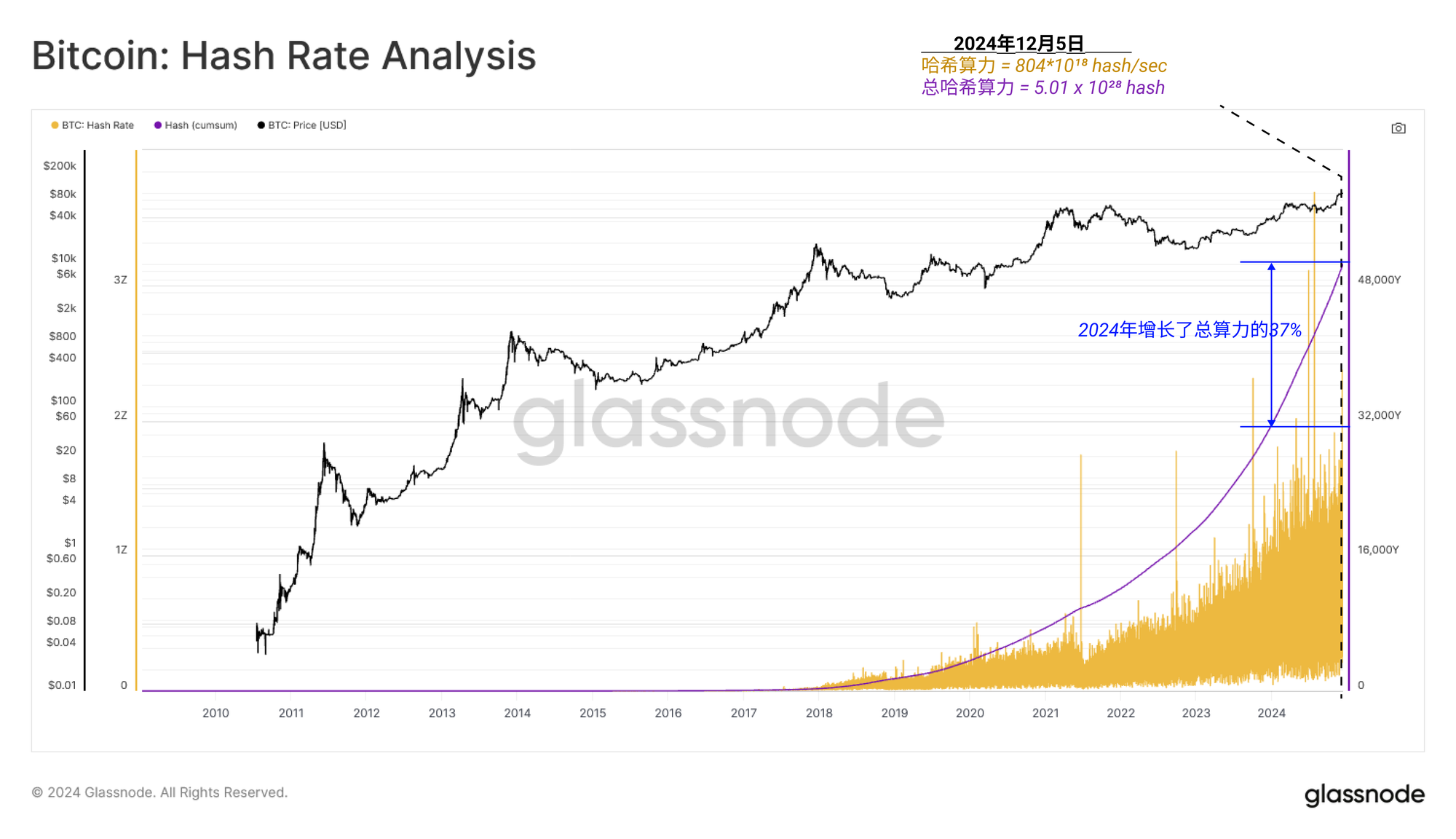 网络哈希率已经从128,185哈希/秒飙升至超过804,407,834,059,443,100,000哈希/秒。到目前为止,矿工们已计算了约5.01 × 10^28个哈希。值得注意的是,2024年期间,计算的总哈希量中有37%发生在这一年。