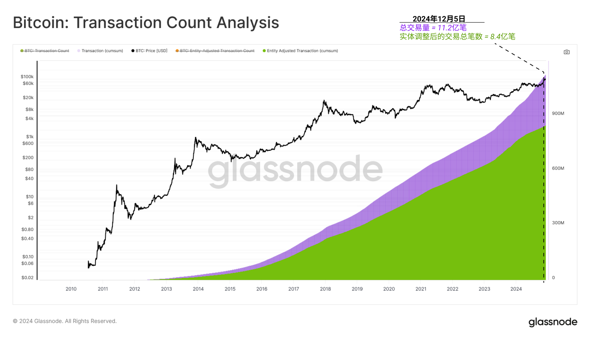 - 比特币网络共处理了11.2亿笔交易,结算了131.25万亿美元的转账量,调整后的数据为我们提供了更清晰的经济活动视角。