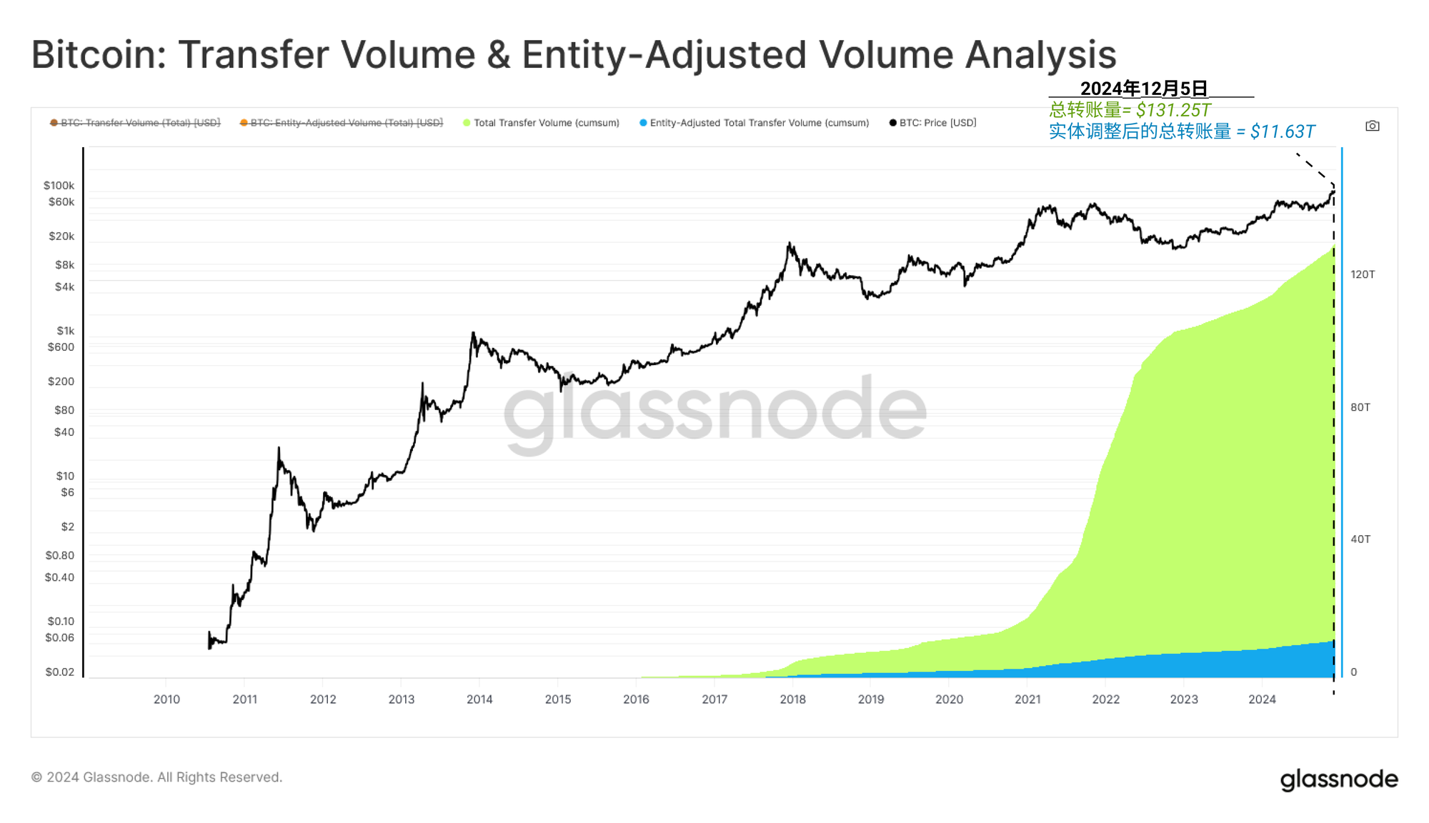 以这些交易确认时的美元价值为衡量标准,比特币网络已累计处理了131.25万亿美元的交易量。经过实体调整后,筛选出的转账量为11.63万亿美元,占总量的8.86%。