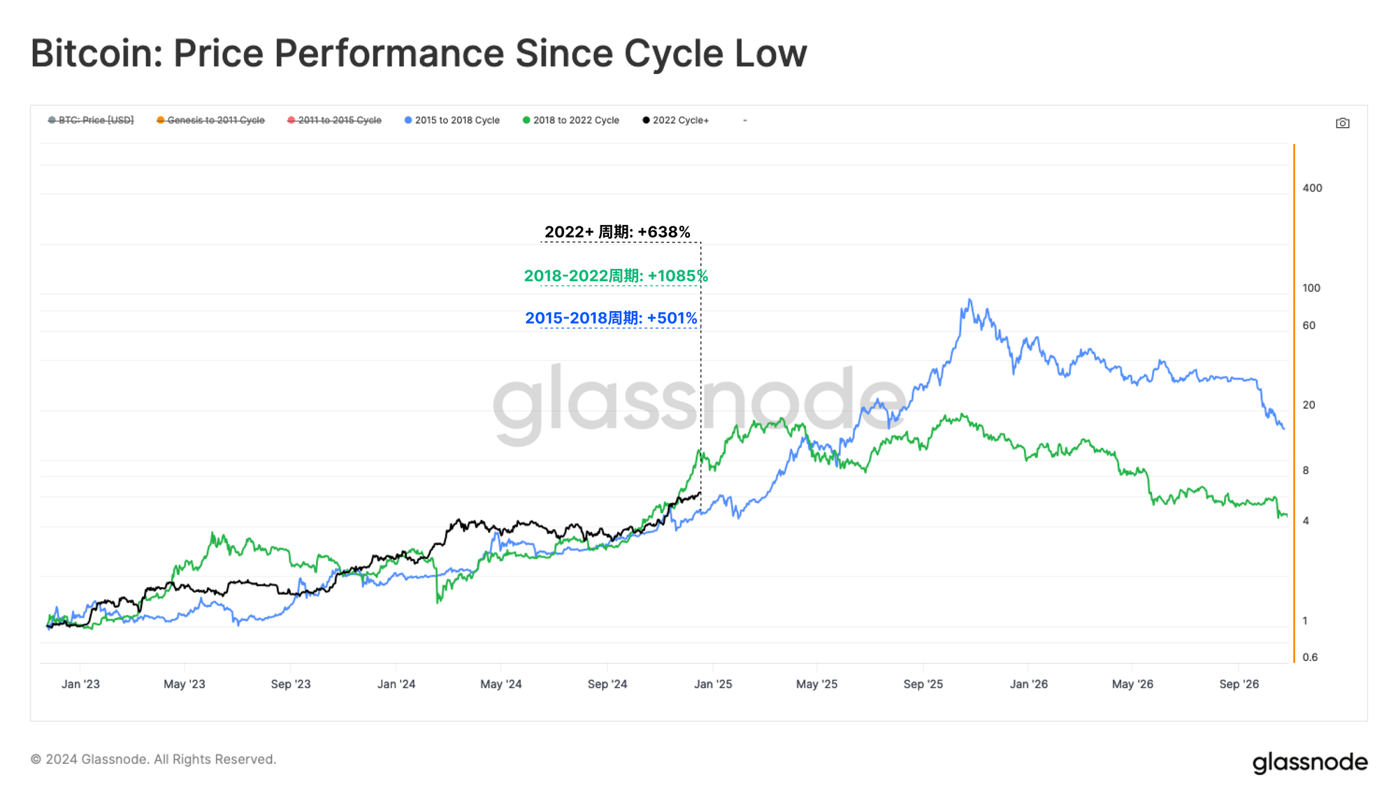 2024年对于比特币而言是又一个非凡之年,年初至今的回报率已超过150%,且BTC价格已维持在10万美元之上数周之久。将当前价格表现与历次周期进行比较,我们发现这一周期与2015-18年和2018-21年周期之间存在惊人的相似性。