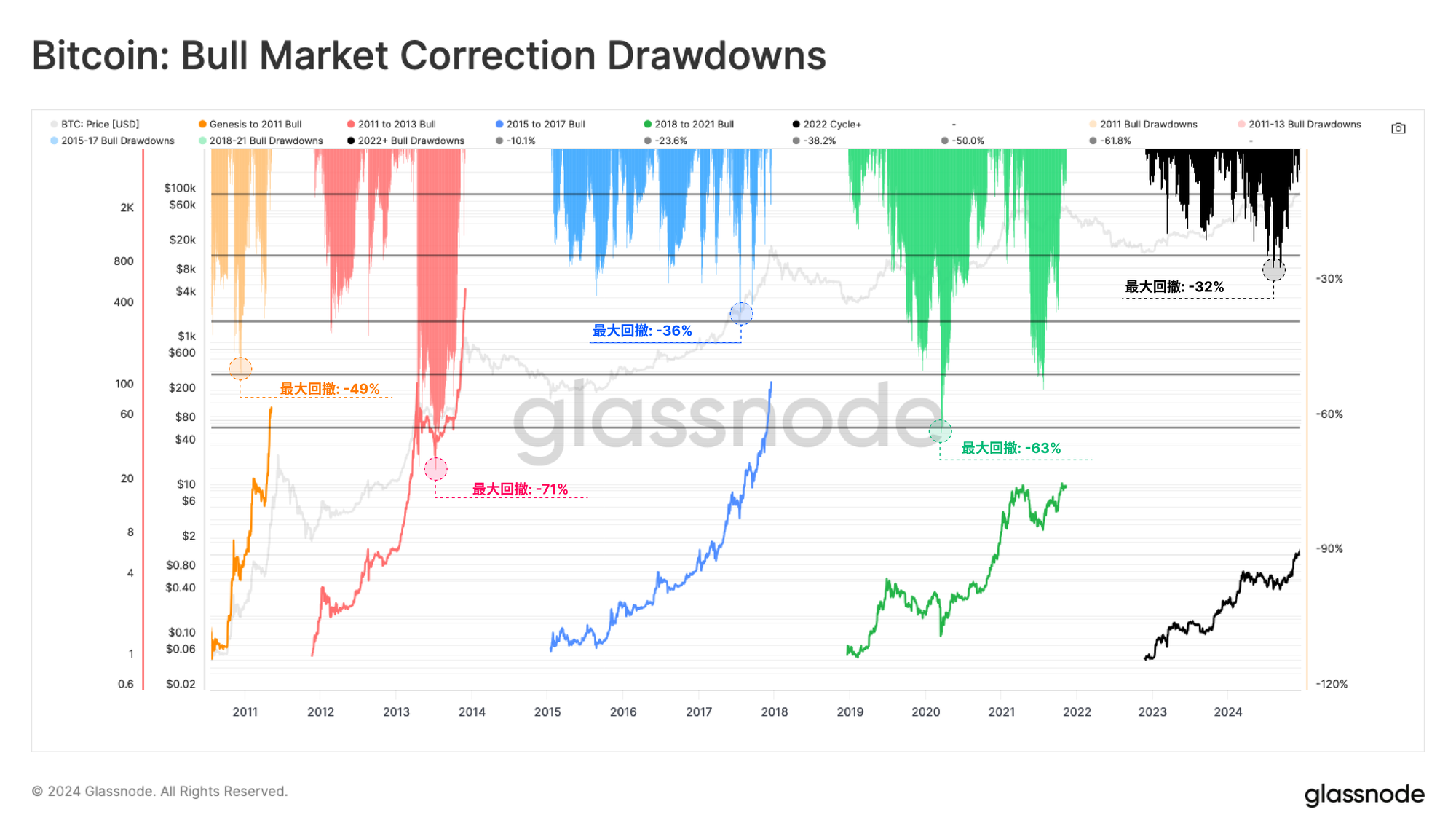 有趣的是,尽管牛市中价格大幅上行通常伴随着极端的抛售压力,但随着市场规模的扩大,每次牛市上涨过程中市场回撤的严重程度逐步减弱。