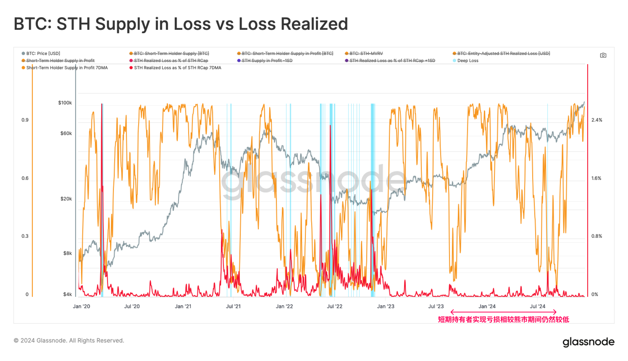 然而,当我们衡量未实现亏损的幅度(纸面亏损,而非亏损币的数量)时,呈现出另一幅图景。尽管绝大部分短期持有者的供应(按币数计算)相较于其成本价“水下”运行,但他们并未承受与市场恶化相关的极端未实现亏损。