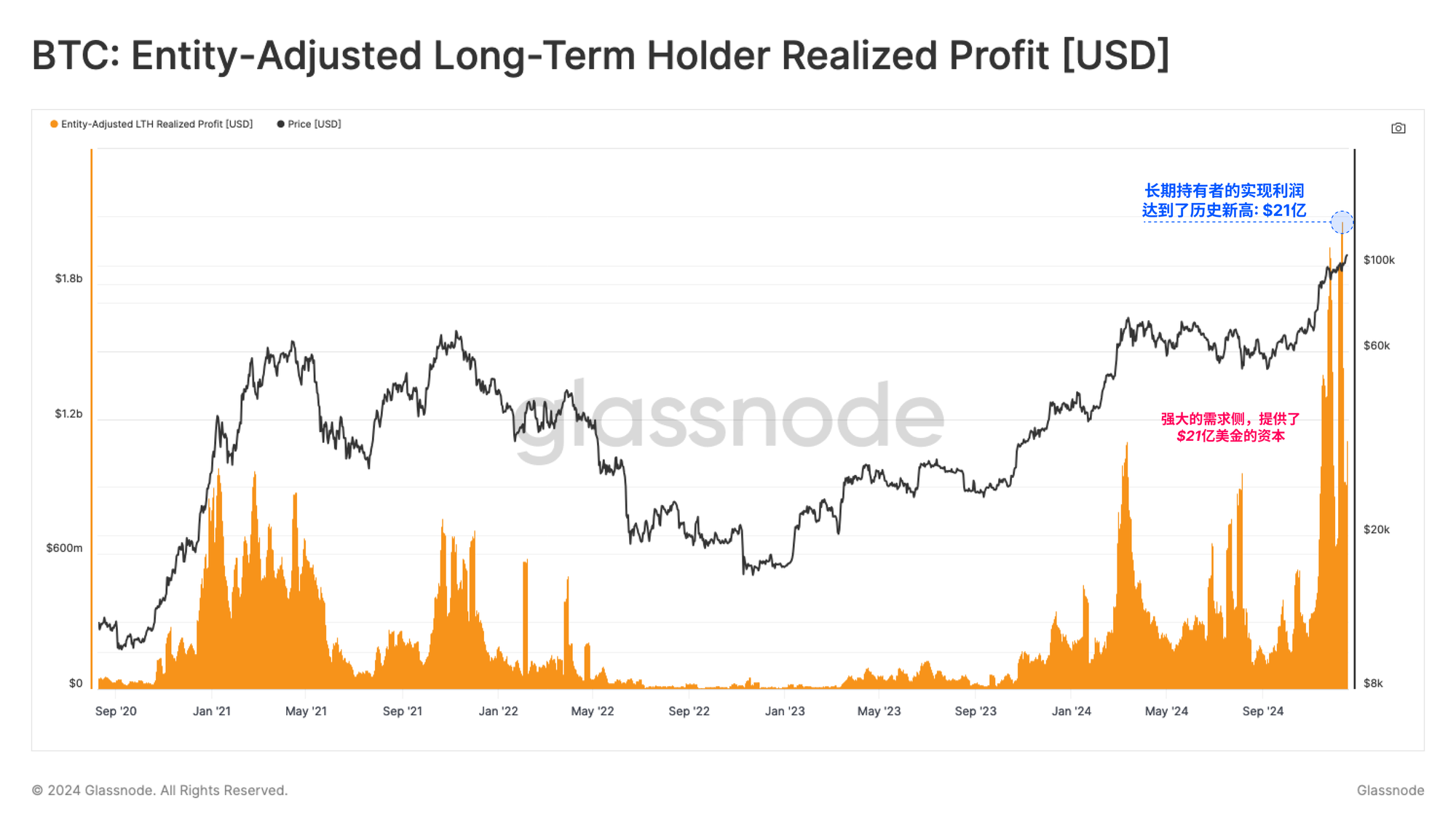 - 在价格已连续数周高于10万美元的背景下,长期持有者抓住机会,将供应卖出至新需求中。这一行为导致实现利润突破21亿美元,创下历史新高。