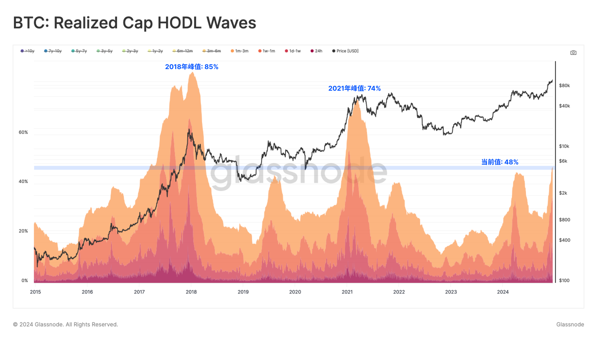 然而,这些新投资者所持有的财富比例尚未达到前几个牛市周期顶峰时的水平。这表明市场可能尚未达到过往周期所见的狂热状态,投机者的饱和度也未达到历史峰值。