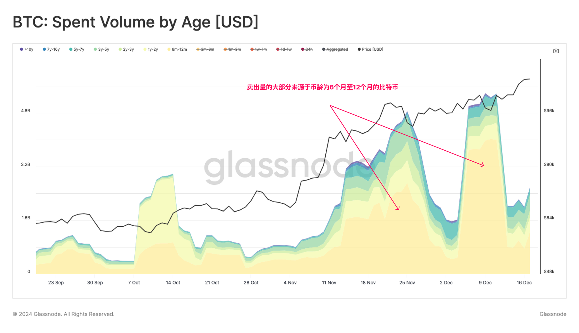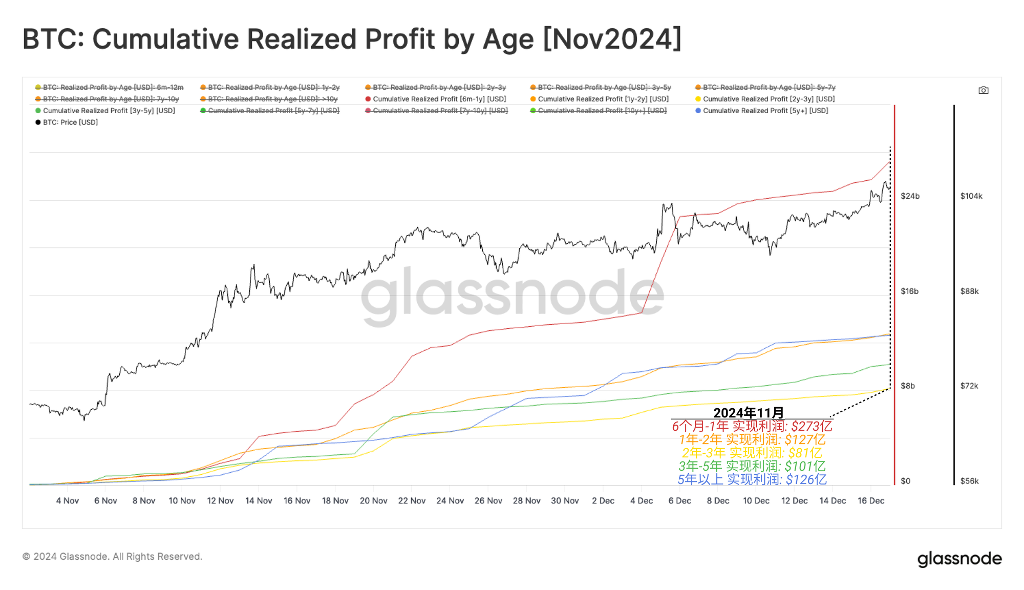 此外,我们还可以利用实现利润指标的币龄分解,评估哪些子群体对抛售压力的贡献最大。在这里,我们计算了自2024年11月以来按币龄分类的累计获利抛售量。