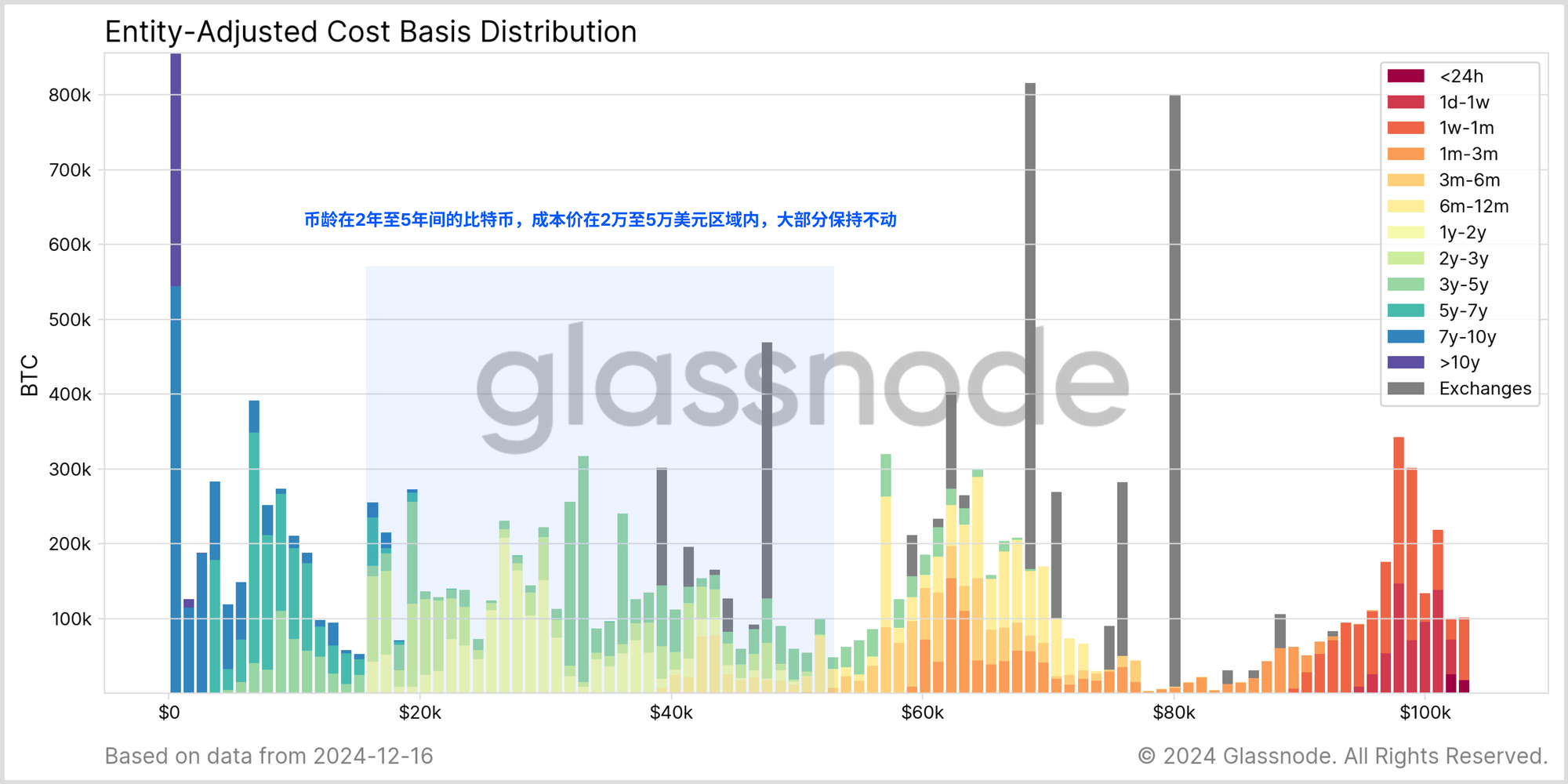 进一步巩固这一论点时,我们可以分析按持有币龄划分的URPD(未实现利润分布)指标。在这里,我们同样观察到,2-5年币龄的大量比特币仍保持不变,这进一步支持了“更高价格才会促使这些持有者释放其持币”的观点。