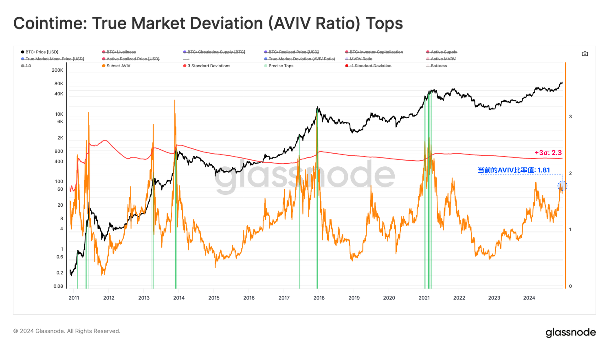 目前,AVIV比率尚未达到+3σ(标准差)的极端区间,这表明市场可能仍有进一步上行的空间,平均投资者的利润水平尚未过于诱人而引发大规模抛售。