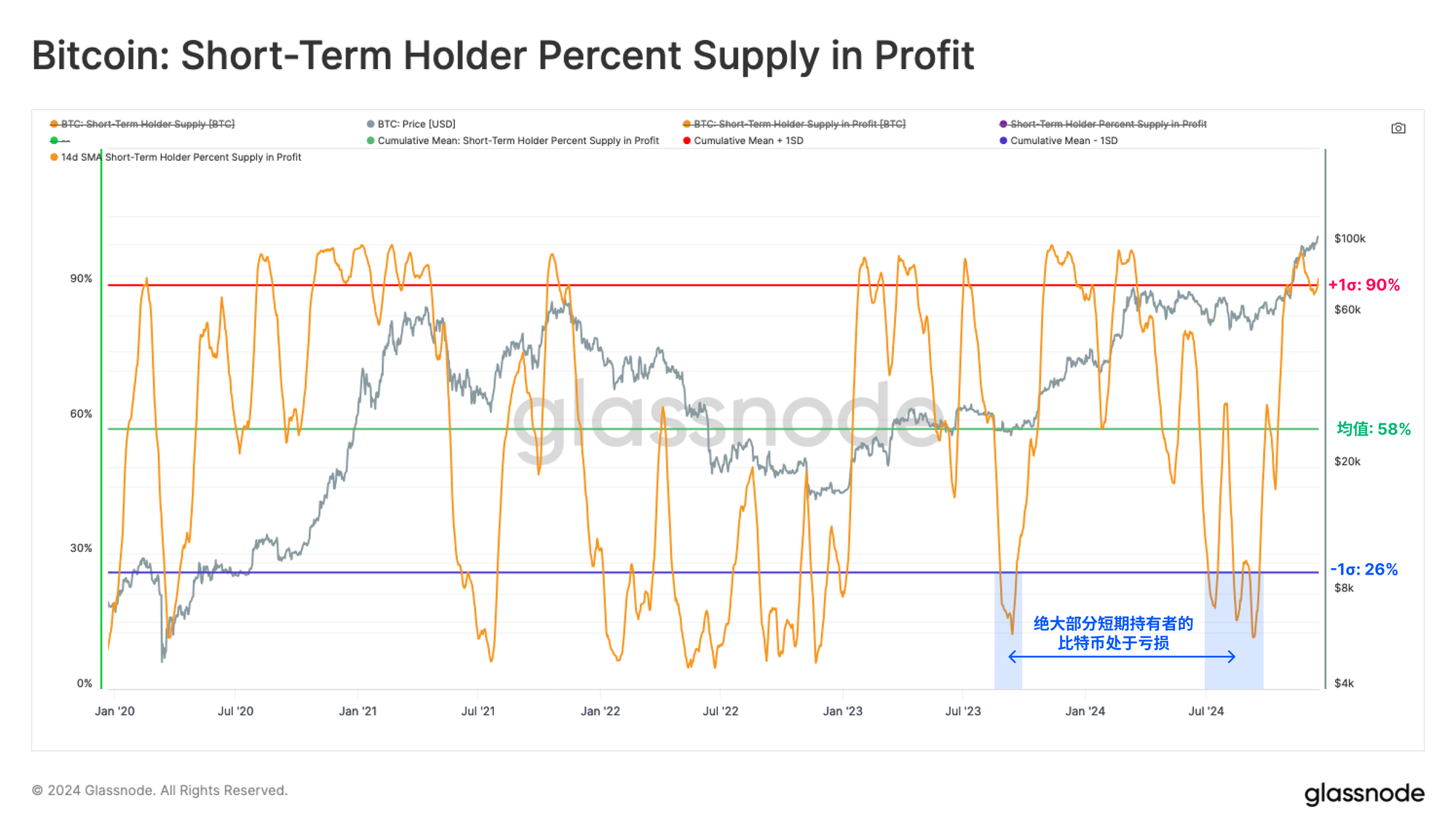 通常情况下,市场极度低迷时期的特征是币供应的主导部分处于亏损状态(币价跌破成本价)。我们可以看到,在2023年8月和2024年9月这两个时期,绝大多数短期持有者的比特币确实处于未实现亏损状态。