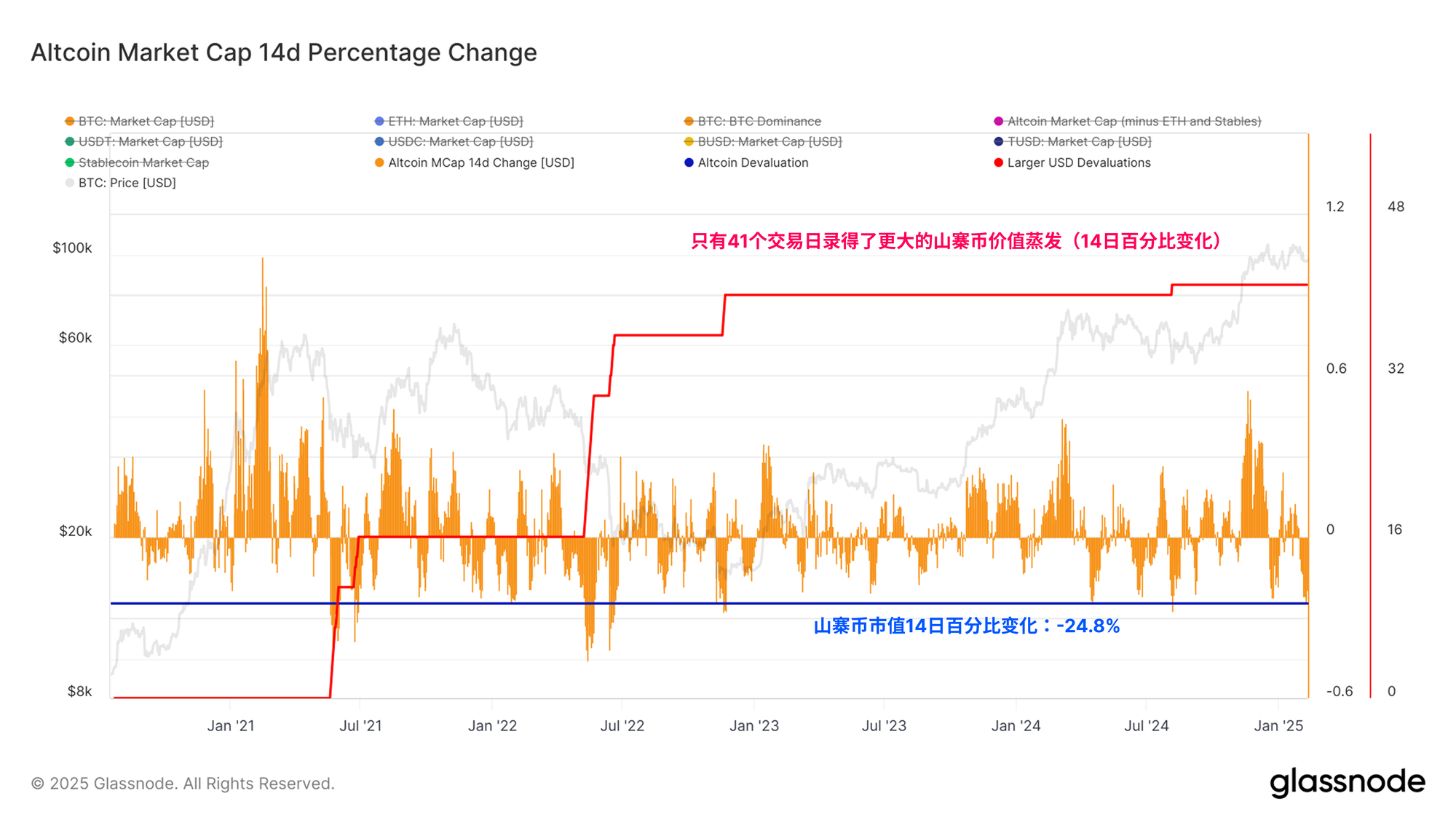 这导致了有记录以来最大规模的山寨币贬值之一,并突显了比特币与此前市场周期中资本通常向山寨币轮动的模式之间的显著脱节。