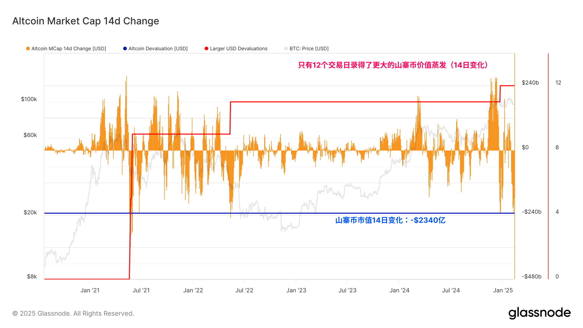 我们可以通过评估全球山寨币市值的 14 天变化来衡量此次回撤的幅度。在过去两周内,山寨币市值下降了2340亿美元,仅有少数交易日的绝对跌幅更大。