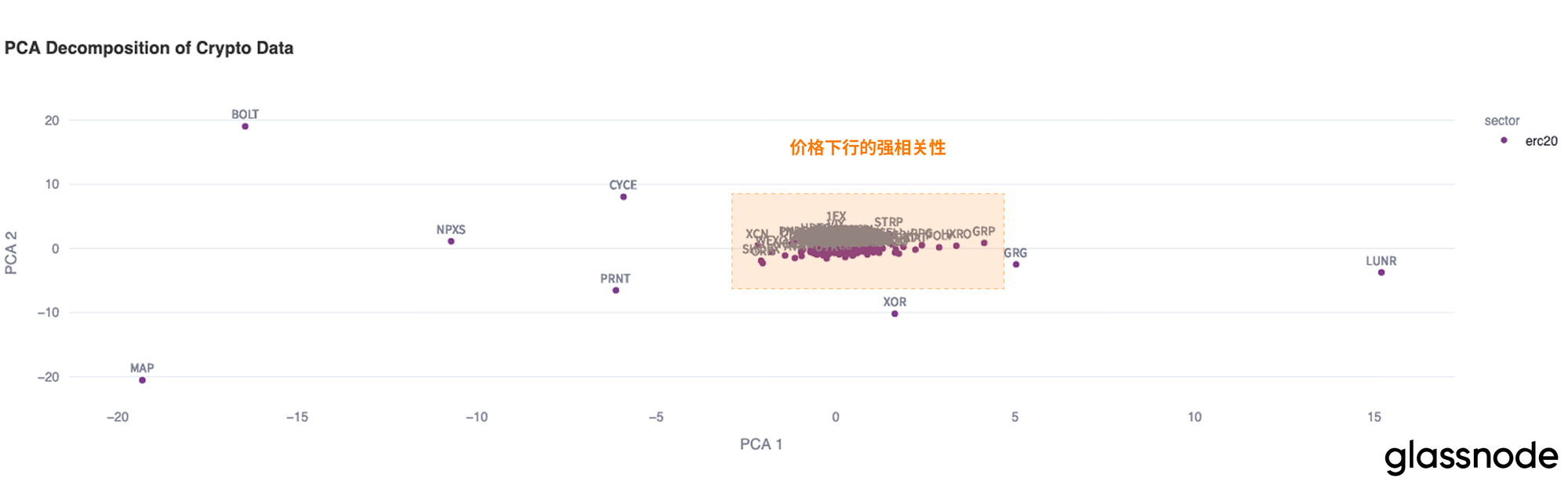 为了分析山寨币市场的下跌趋势,我们可以使用主成分分析(PCA),该方法将代币收益的相关性投影到二维空间中。这种可视化分析有助于识别收益表现相似(聚集在一起)或不同(相距较远)的代币。