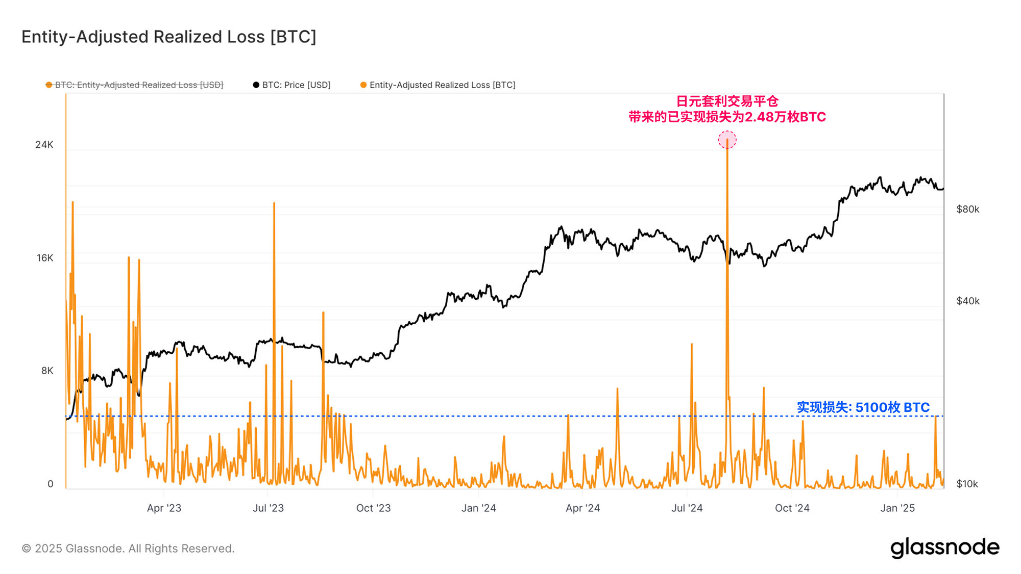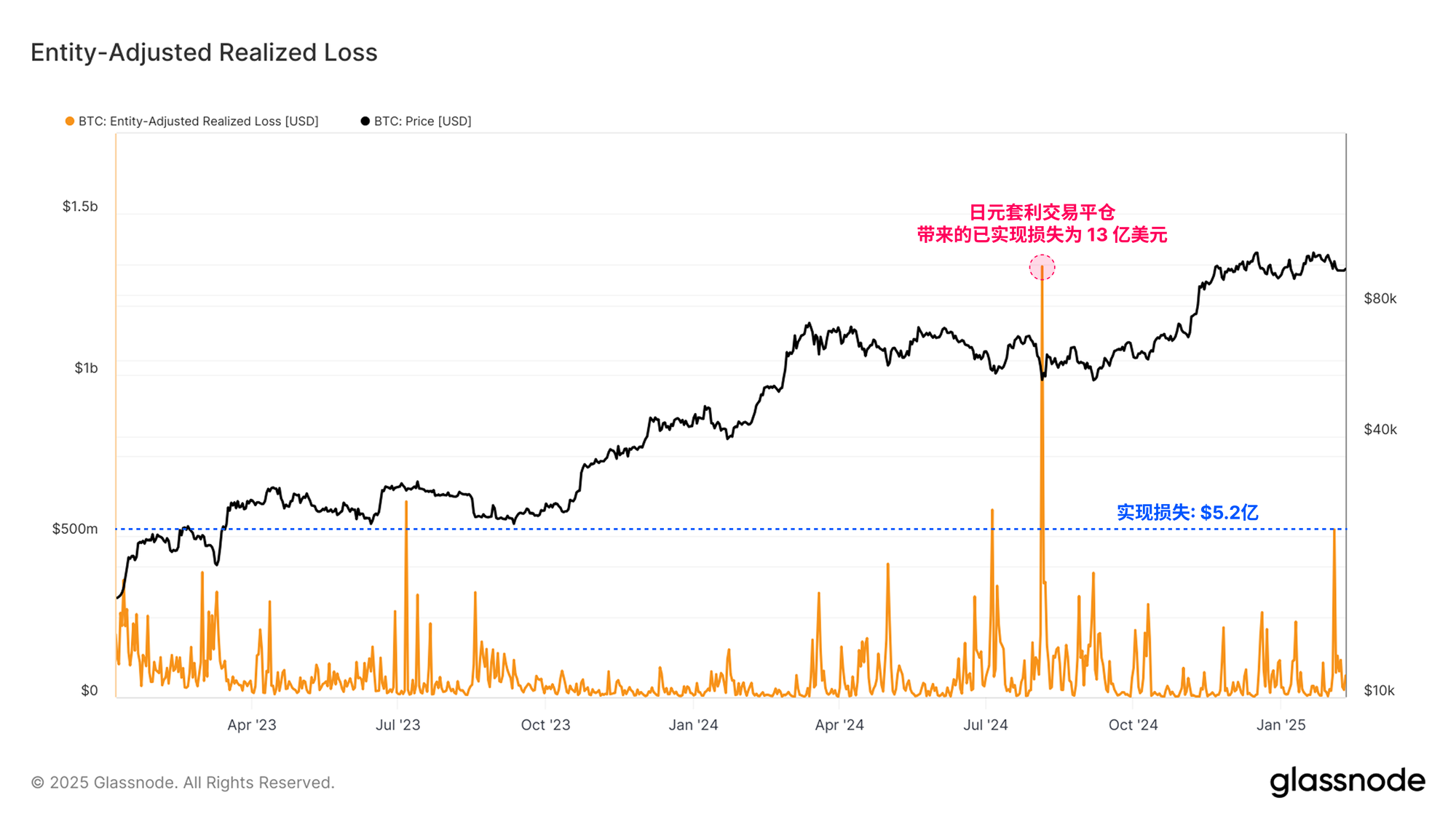 因此,在宏观牛市上行趋势的背景下,我们可以将此次事件视为一次重要的恐慌性抛售。唯一超过这一亏损规模的单日事件发生在2023年8月5日,即日元套利交易平仓期间,当时市场录得了13亿美元的已实现亏损。