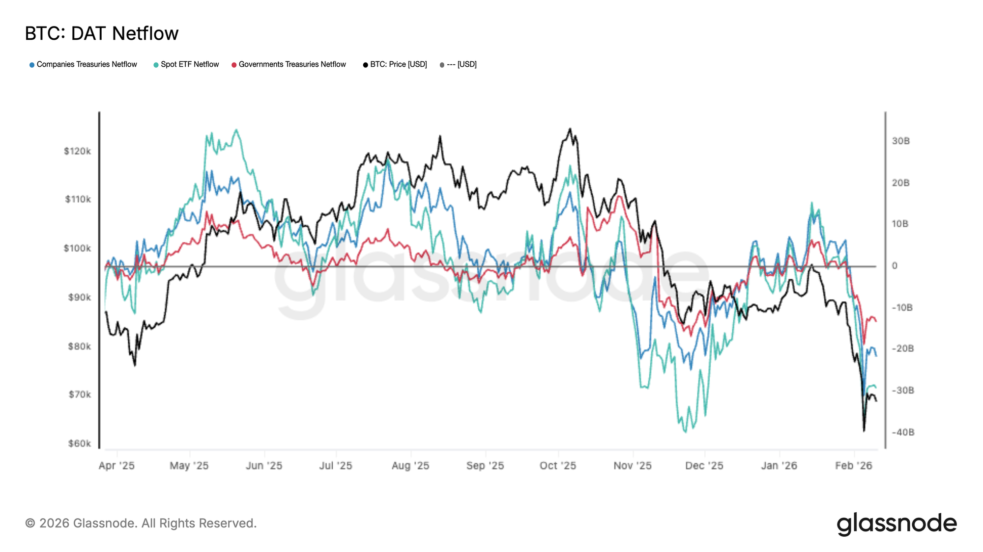 数字资产财库(DAT)资金流已急剧转负。随着比特币交易至近期新低,现货ETF、企业及政府财库均同时录得净流出。ETF财库主导了大部分波动,而企业和主权资金流则进一步证实了抛售压力是普遍存在的,而非孤立现象。这种一致性预示着去风险意图的明显转变,边缘化的机构需求已经退缩,而供应正主导着近期的订单流。