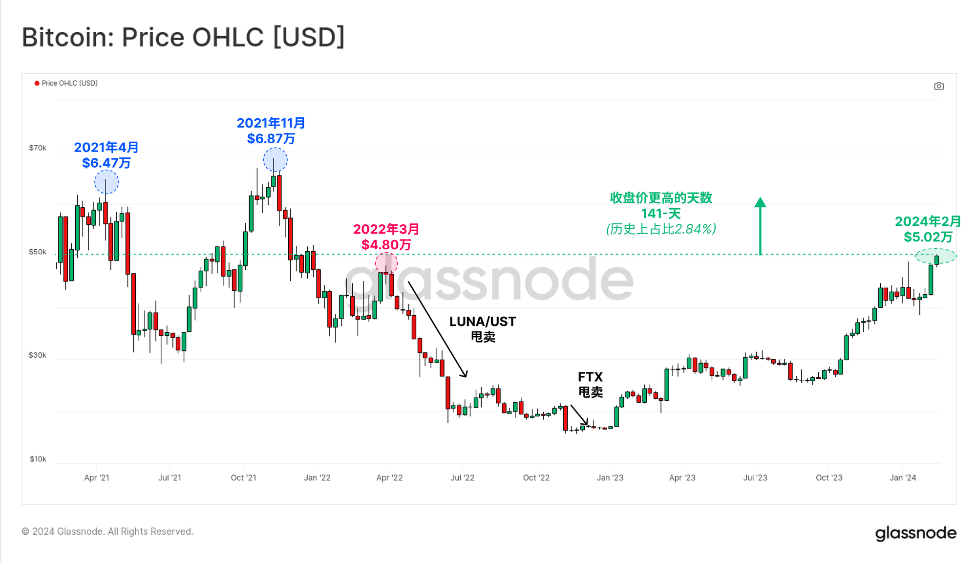 比特币投资者继续享受着积极而强劲的一年,比特币市场交易价格创下50200美元的多年新高,年度回报率达到 +18.5%。在2021年,只有141天的日收盘价高于50200美元,仅占比特币交易历史的 2.84%。