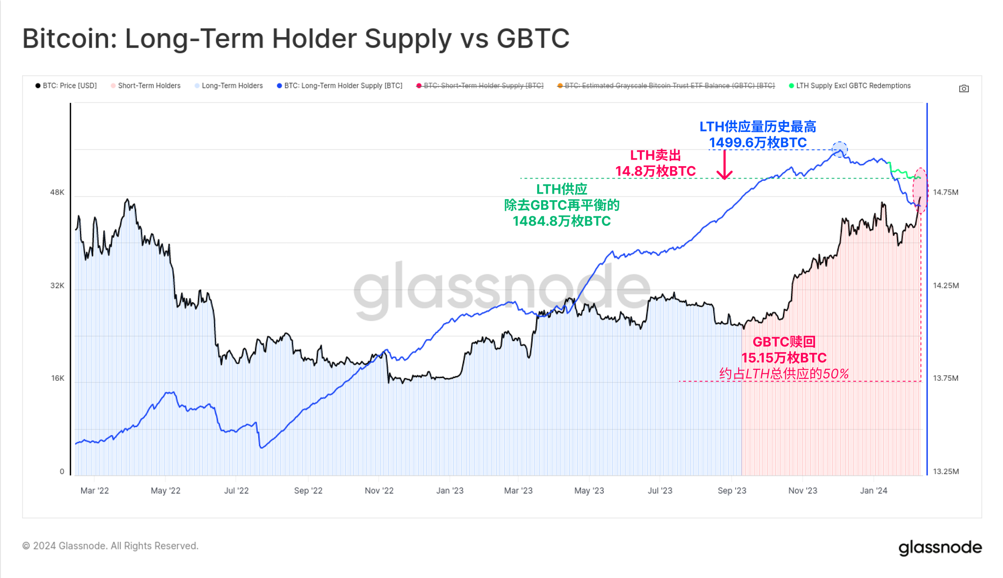 - 自2023年11月供应量达到峰值以来,长期持有者已经卖出了约30万枚BTC。其中一半以上是GBTC的流出量。