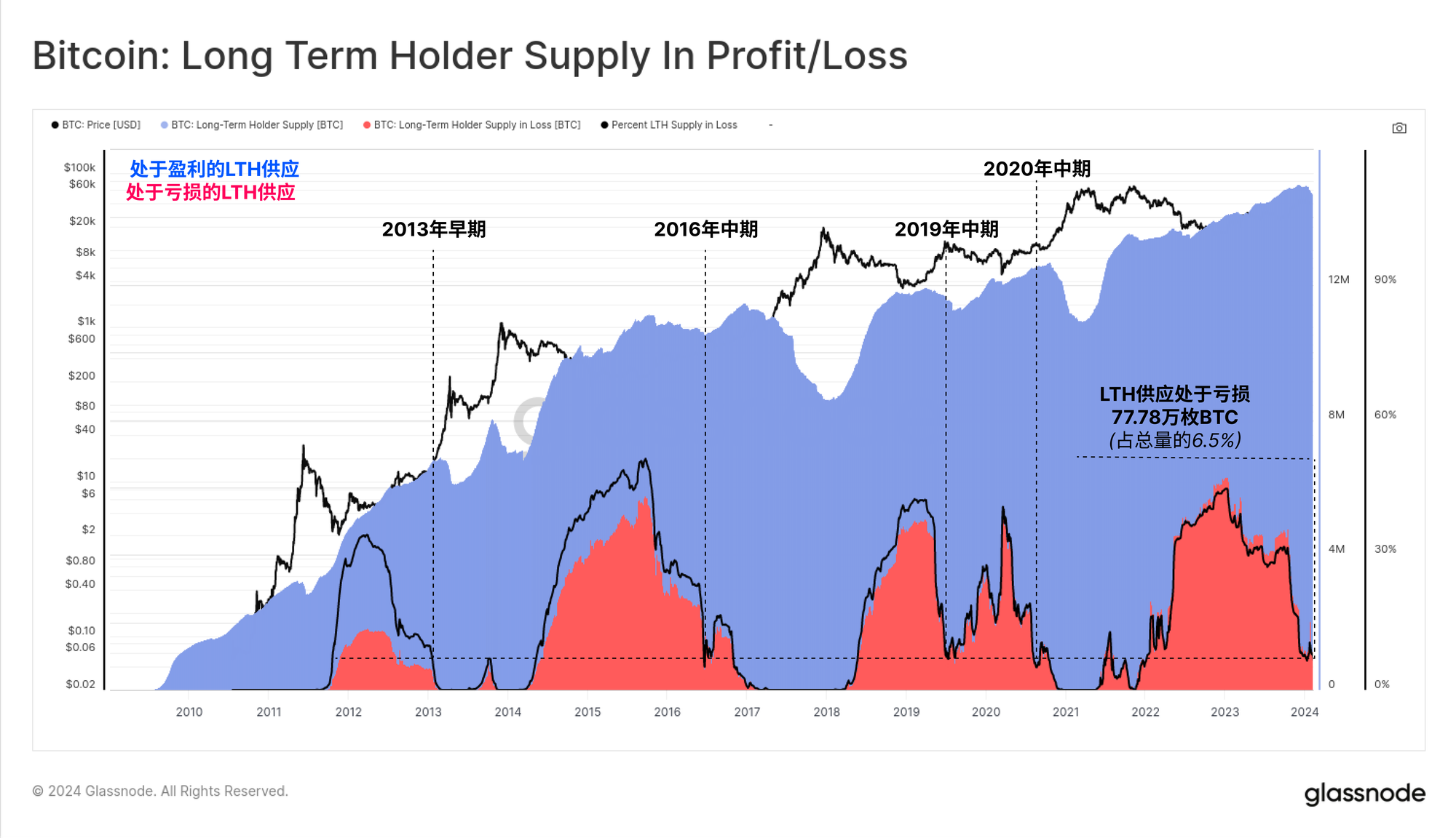 以往 LTH 币群持有类似币量的亏损情况与早期牛市情况相对应(2019 年是一个可论证的异常值)。