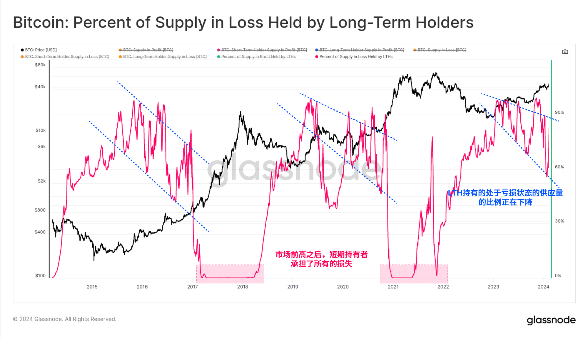 • 高风险条件 - 当损失中的STH供应量急剧增加,往往达到总供应量的超级多数时,表明市场 "头重脚轻"。许多投资者现在被困在不利的购买价格中。