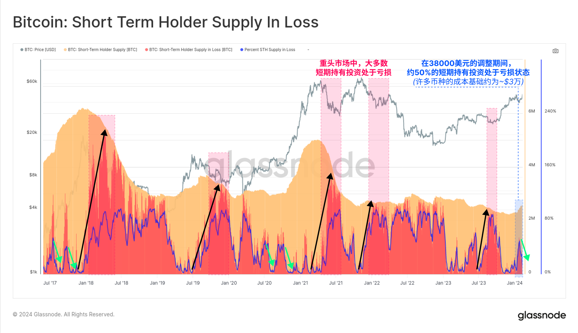 • 典型修正条件 - 当亏损的STH供应量增加,但不超过其持有量的60%。这表明有一部分新投资者因成本基础不利而被套牢,但许多从较低价格购入并仍在持有的投资者对其进行了平衡。