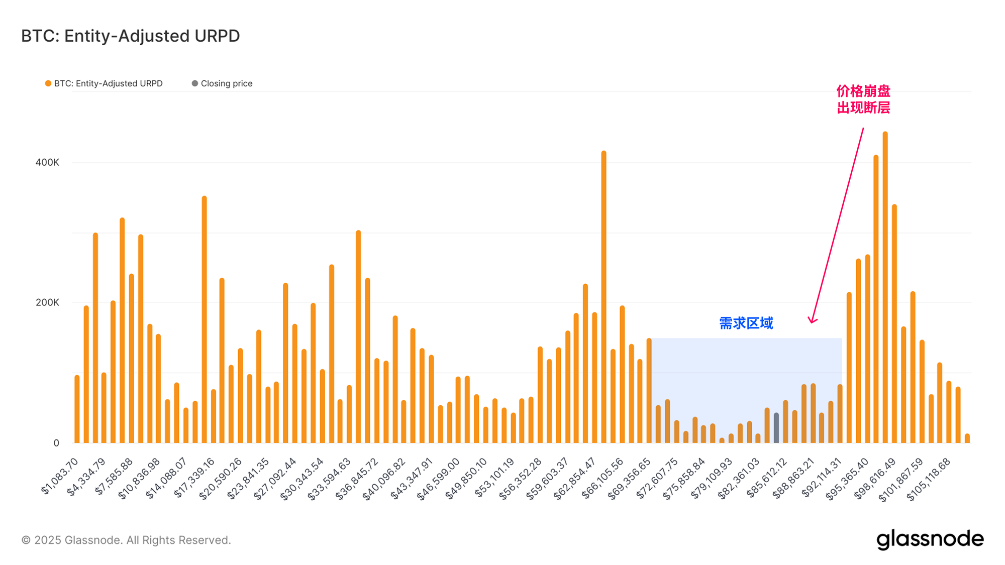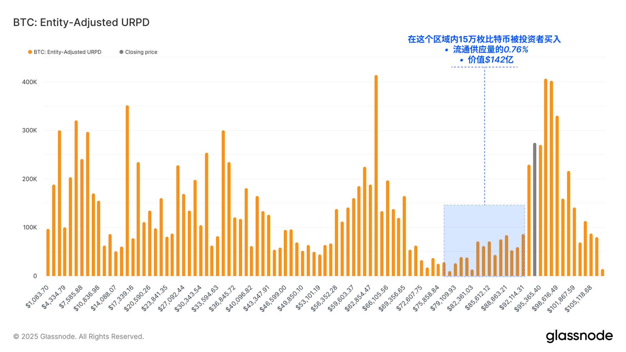 价格正开始回升至该区域的上界,目前尚不清楚,$90,000 以上大规模持仓的投资者是否会将本轮反弹视为流动性退出的机会,并选择割肉止损。
