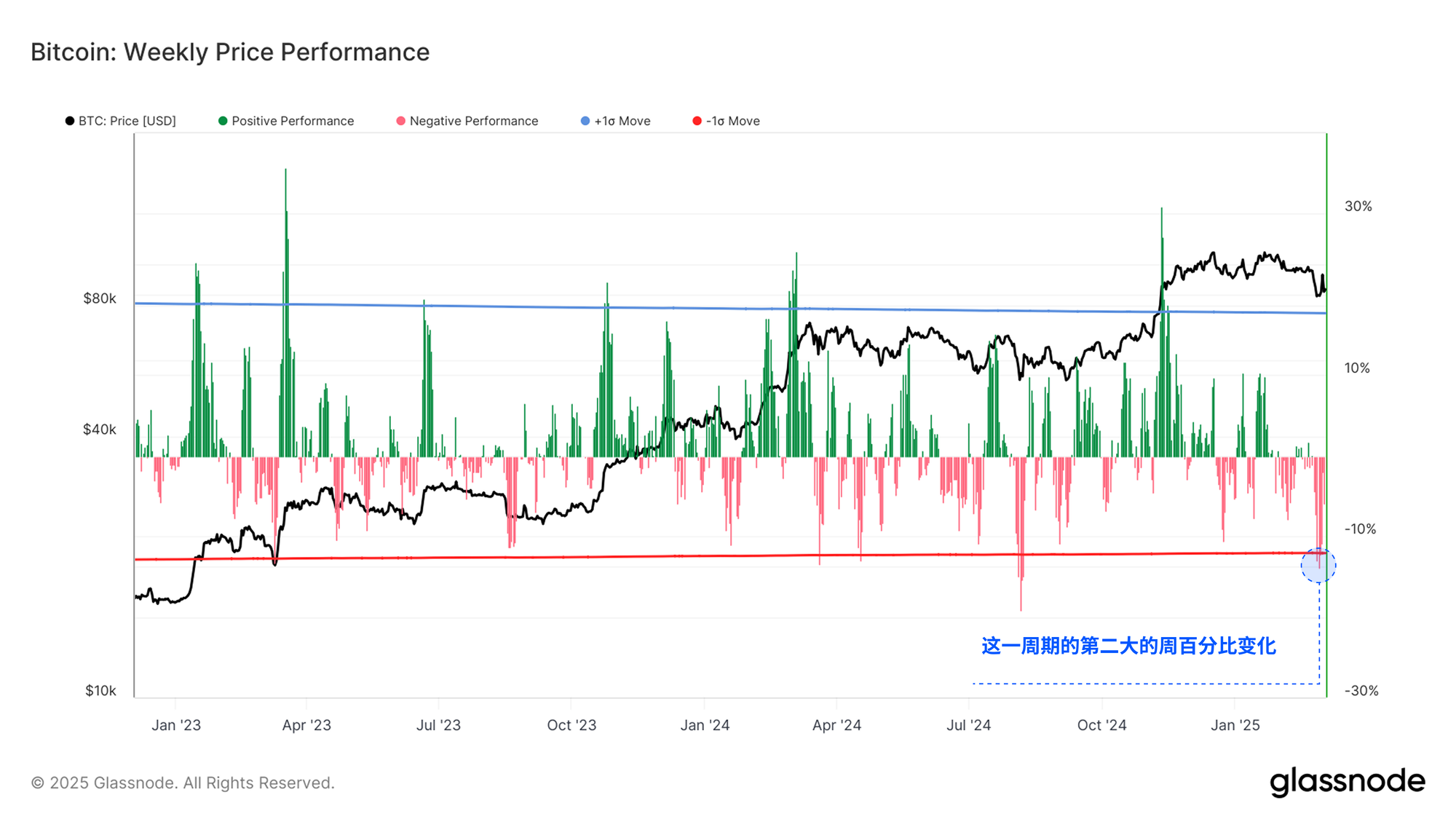 尽管比特币相较于其他主要资产表现更具韧性,但本轮抛售仍然是本周期内第二大的单周跌幅。过去一周市场下跌了 -13.9%,仅次于 2024 年 8 月 5 日发生的日元套利交易平仓事件。