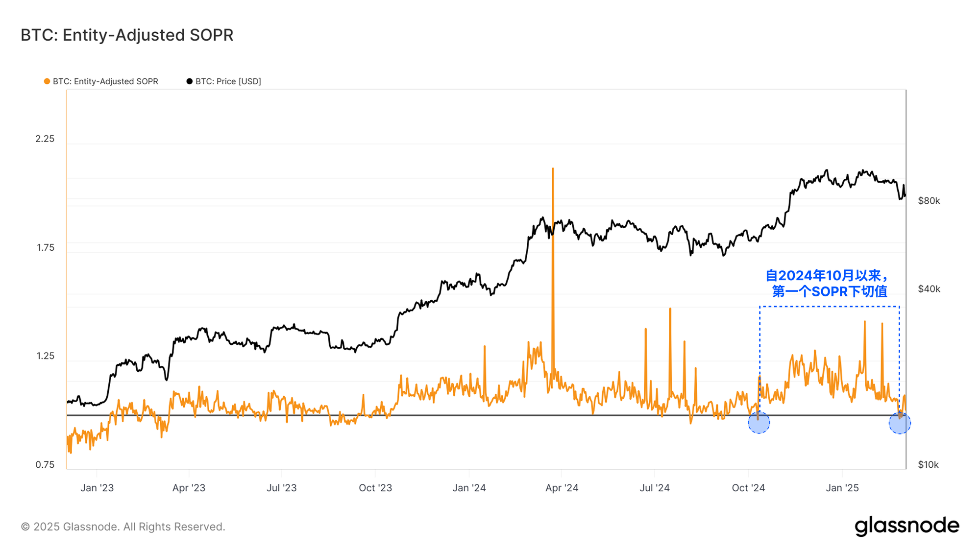 从 SOPR 指标的角度来看,该指标衡量投资者锁定的平均盈亏倍数,我们注意到这是自 2024 年 10 月以来首次出现亏损主导的情况。
