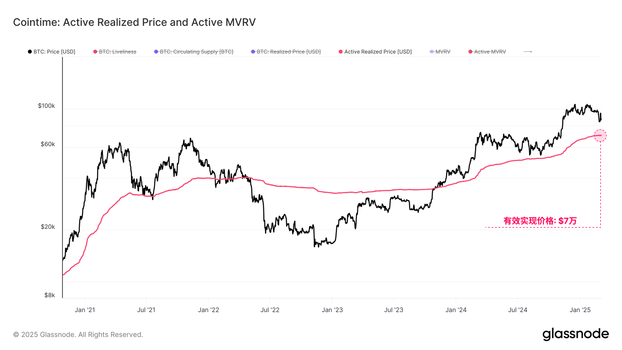 已实现活跃价格可进一步增强这一评估。已实现活跃价格提供了更符合实际情况的活跃投资者成本基础估算。由于 50% 的交易日价格高于或低于该水平,因此这一水平可被视为牛市与熊市的关键分界线。