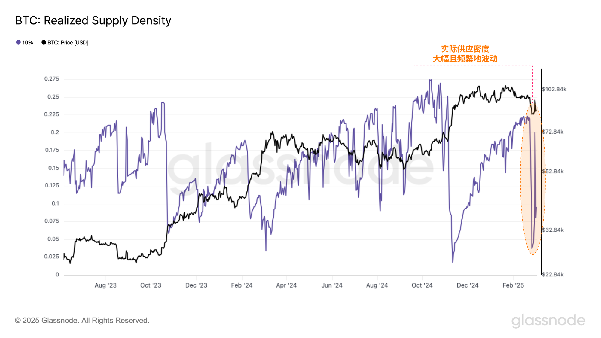 已实现供应密度(Realized Supply Density)指标量化了当前现货价格 ±10% 区间内供应的集中程度。当供应高度集中于现货价格附近时,即使是小幅波动也可能显著影响投资者的盈利状况,从而加剧市场波动性。