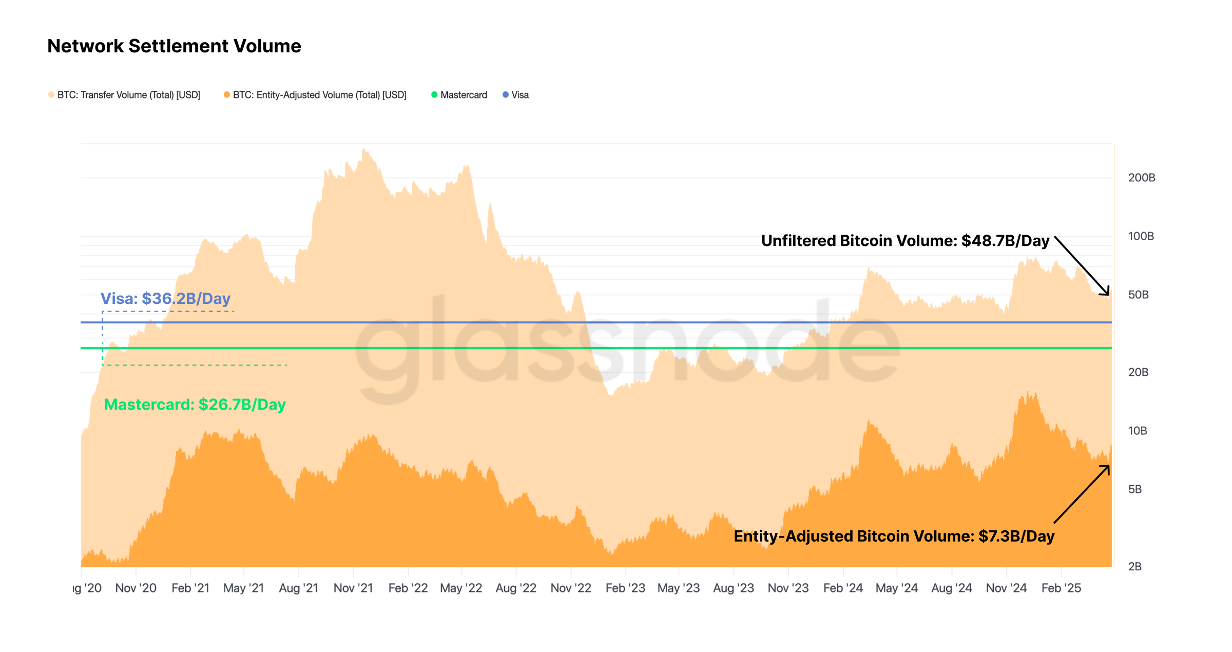 Even amid declining volatility, Bitcoin remains a dominant global settlement layer, rivaling traditional networks like Mastercard and Visa in transactional throughput.