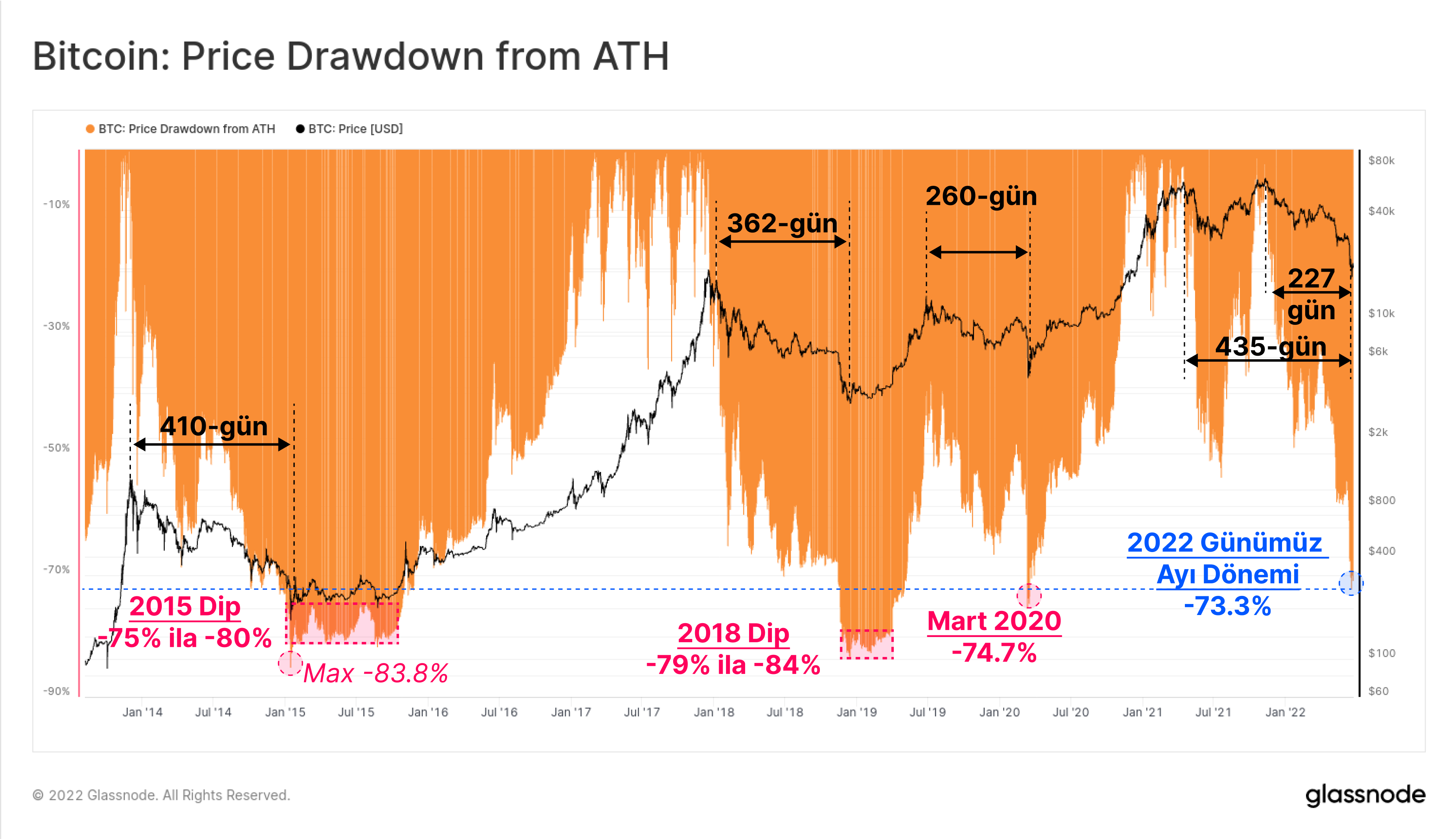 Mevcut düşüşün Kasım 2021 ATH'nin %-73.3 altına ulaşması ve 227 gün ile 435 gün arasında bir süre kalmasıyla, bu ayı piyasası artık kesin olarak tarihsel normlar ve büyüklük içinde.