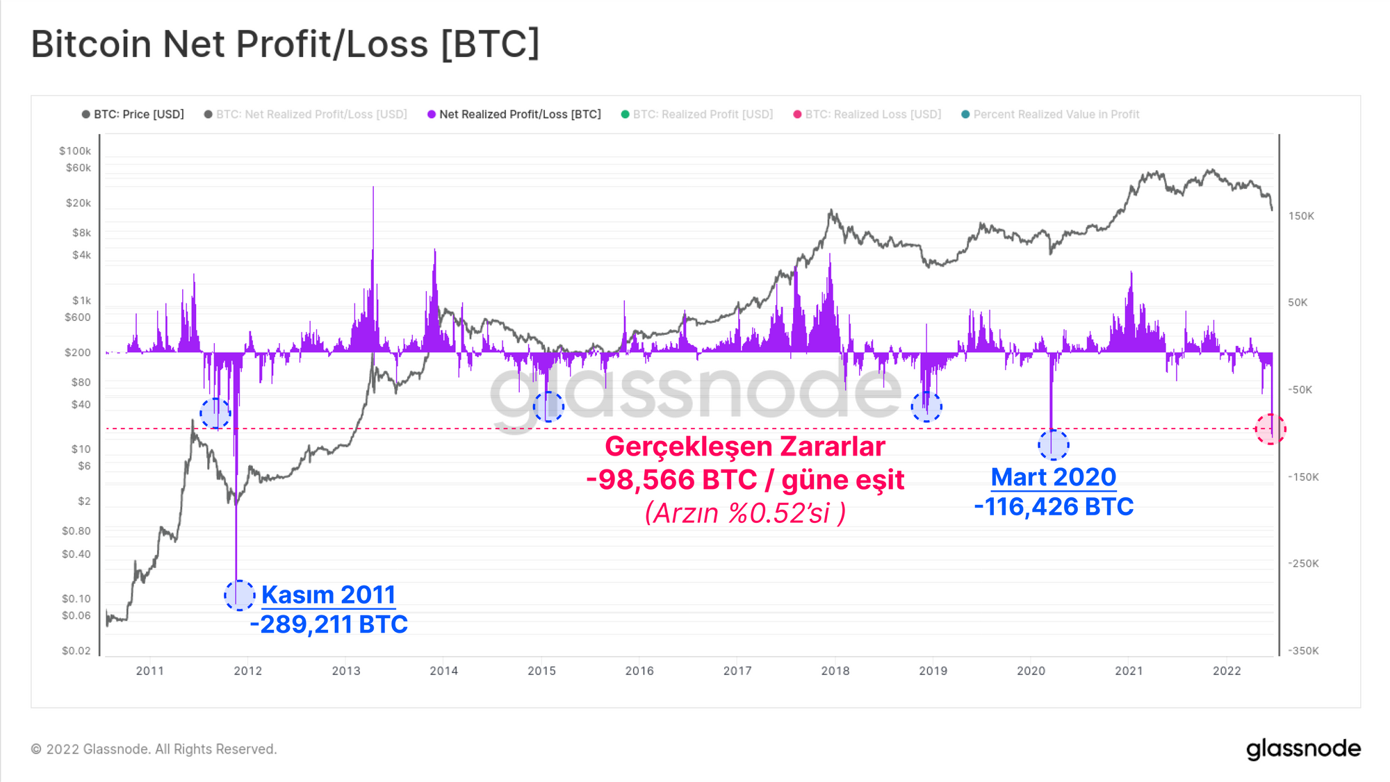 Net Gerçekleşen Kâr/Zararı, piyasa büyüklüğü için etkin bir şekilde normalleştiren BTC birimleri cinsinden ölçerken, mevcut düşüş, günlük -98.566 BTC'ye (dolaşımdaki arzın %0.52'si) eşdeğer Gerçekleşen Zararlar kaydediyor. 2011 ayı piyasasında ve Mart 2020'de bulunan, daha büyük kaydedilen Gerçekleşen Zararlarla yalnızca iki kayıtlı işlem günü olmuştur.