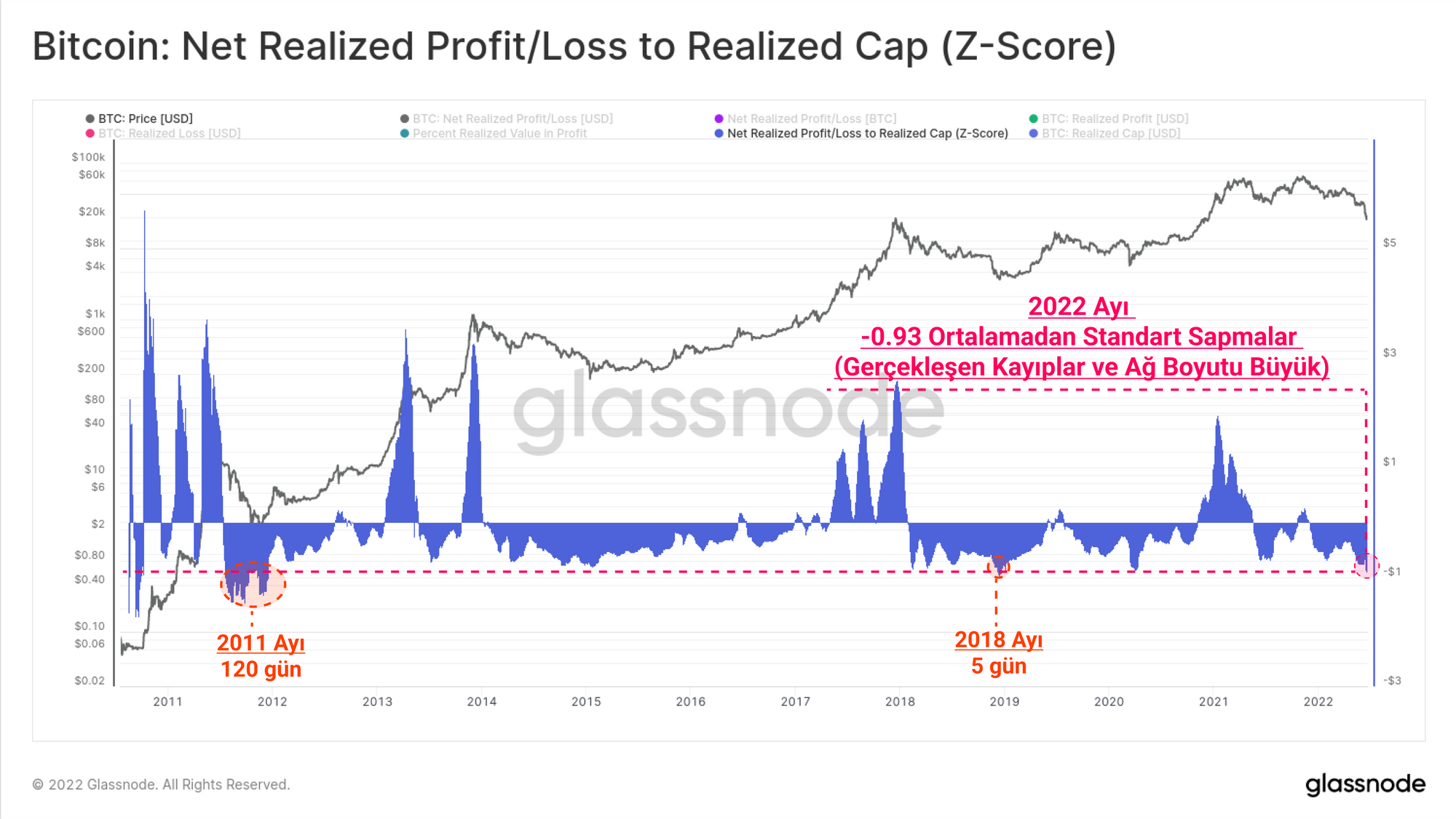 Mevcut okuma, -0.93 SD ortalamasından negatif bir sapmayı gösterir. Bitcoin'in ticaret geçmişinin sadece %3,86'sını yansıtan daha düşük bir değerde sadece 150 gün kapandı. Bu, 2022 ayının ne kadar şiddetli olduğunu ölçmek için daha fazla bulgu elde etmemizi sağlıyor.