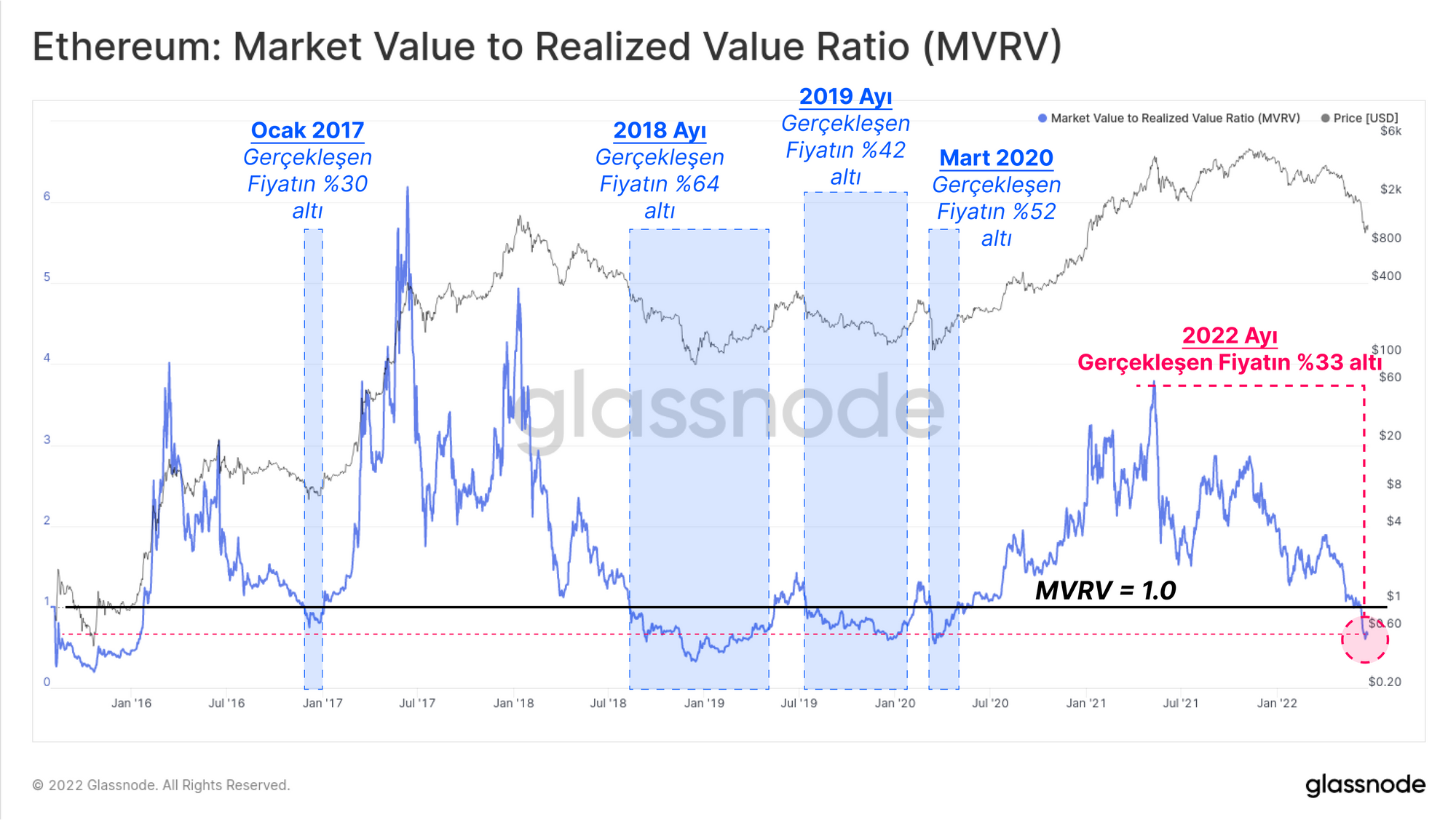 Artık Etheruem Realized Cap'i değerlendirmek ve böylece Bitcoin ve Ethereum ayı piyasalarının ölçeğini karşılaştırmak için Bitcoin için kullandığımıza benzer bir çerçeve uygulayabiliriz. Ethereum MVRV Oranı şimdi dengenin çok altında negatif sapmalara ulaşıyor ve şu anda piyasanın toplam -%33 gerçekleşmemiş bir kayıp tuttuğunun sinyalini veriyor.