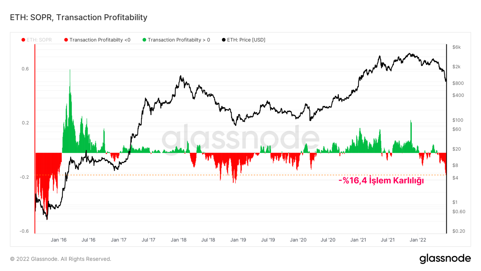 Gerçekleşen kayıpların ağır hakimiyetinin, ayı piyasalarında aşağı yönlü fiyat hareketine eşlik ettiği görülebilir. Mevcut pazarda, ortalama ETH transaktörü, harcanan coinlerde %-16.4'lük bir kayıp gerçekleştiriyor. Bu kadar zayıf işlem karlılığı en son ETH'nin 84 dolardan işlem gördüğü 2018 ayı piyasasının derinliklerinde görüldü.