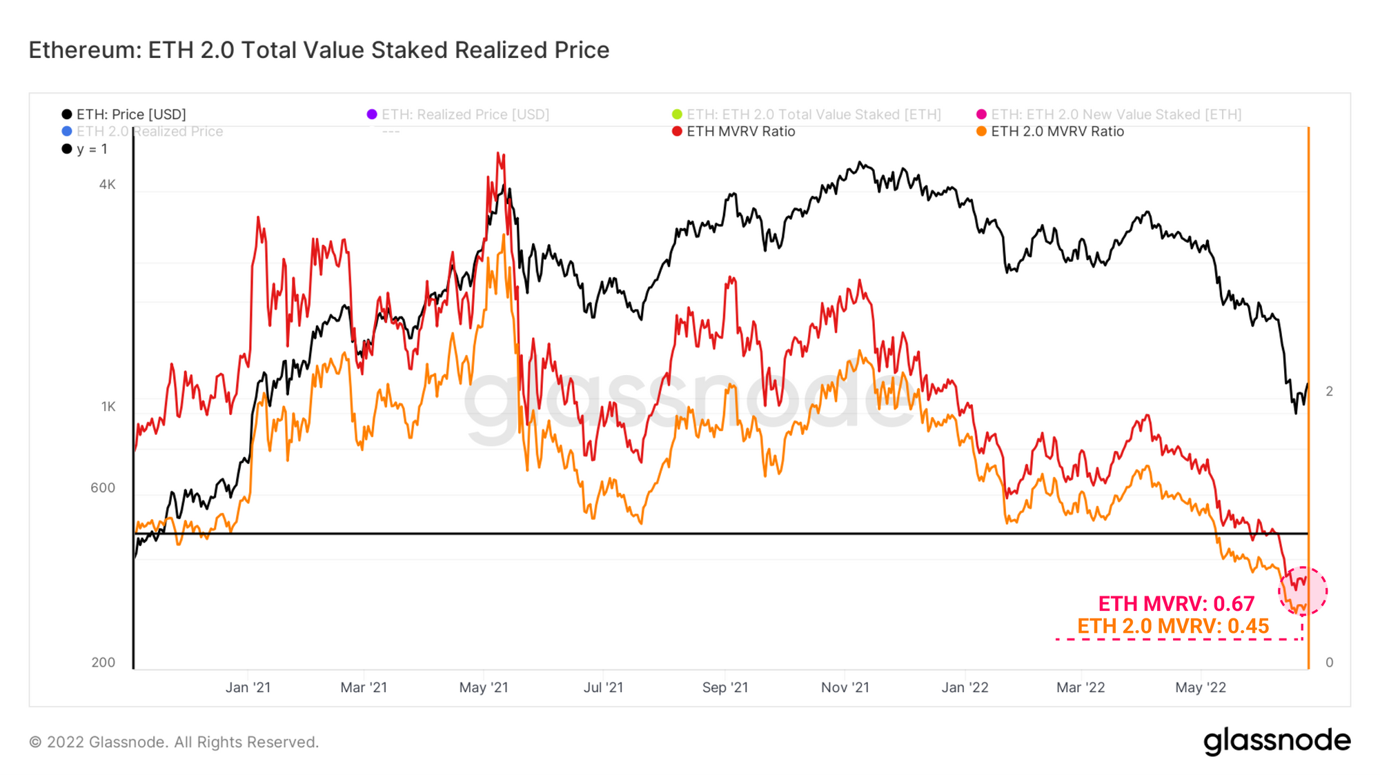 ETH 2.0 mevduatları için MVRV Oranı, mevduatların yapıldığı andaki fiyat etiketine göre de hesaplanabilir. Nispeten, stake edilen ETH başına ortalama fiyat, mevcut spot fiyatın iki katından fazla olan 2,4 bin dolar. Bu durum, ETH 2.0 Staker'larını ortalama ETH yatırımcısına kıyasla -%22 daha kötü performans olan toplam -%55 gerçekleşmemiş zarara sokuyor.
