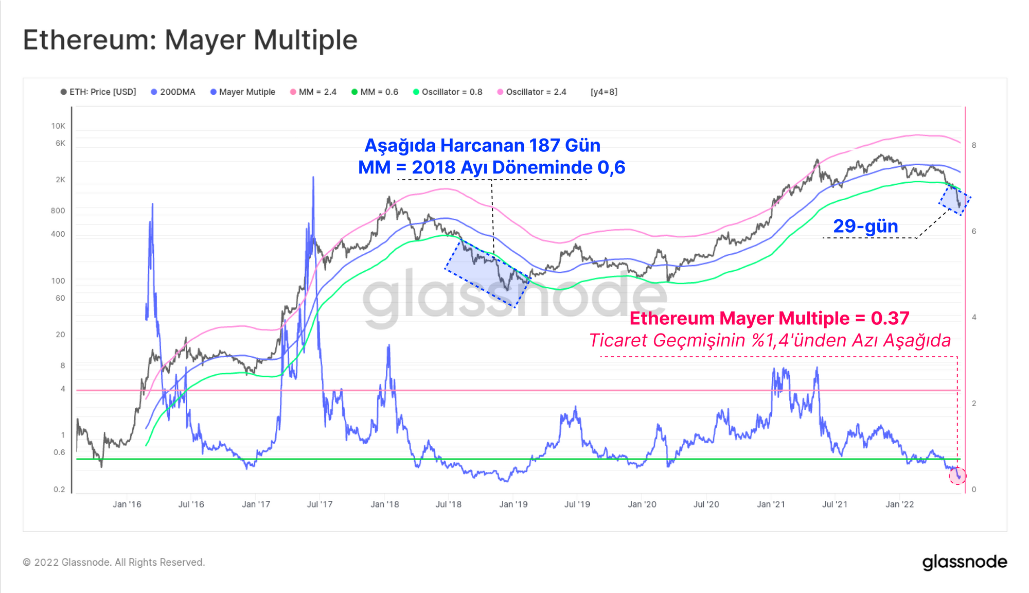 0,6 Mayer Multiple Bandı, tüm ETH işlem günlerinin yaklaşık %10'unun altında olduğu bir aşağı yönlü sapma seviyesini temsil ediyor. 2018 ayı piyasasında ETH, fiyat hareketinin en kötüsü sırasında bu bandın altında 187 gün geçirdi. Mevcut piyasada ETH, Haziran ayının başından bu yana bu bandın altında işlem gördü ve şu anda 29 gündür altında.