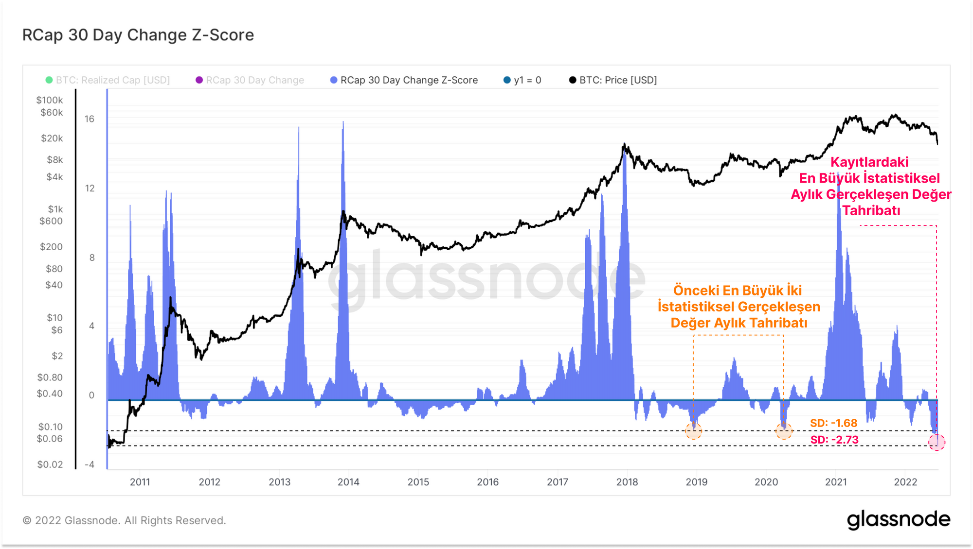 Gerçekleşen Üst Sınırın (Z-Skoru) 30 Günlük Pozisyon Değişikliği, BTC varlığına göreceli aylık sermaye girişini/çıkışını istatistiksel olarak görmemizi sağlar. Bu ölçümle, Bitcoin şu anda tarihteki en büyük sermaye çıkışı olayını yaşıyor ve ortalamadan -2.73 standart sapmaya (SD) ulaşıyor. Bu, 2018 Ayı Piyasasının sonunda ve yine Mart 2020 satışlarında meydana gelen en büyük olaylardan daha büyük bir SD'dir.