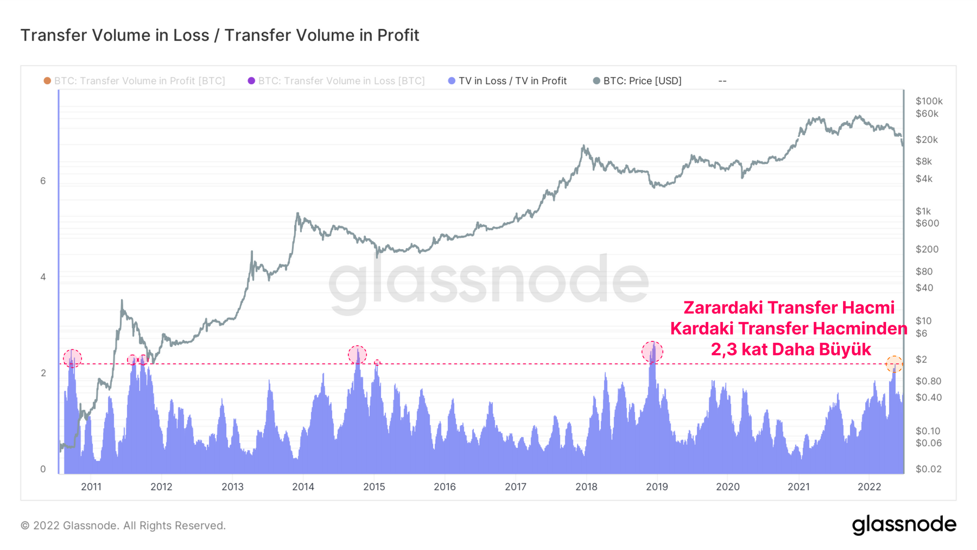 Son olarak, aylık ortalama bazında Kayıptaki Transfer Hacmi ile Kardaki Transfer Hacmi arasındaki oranı değerlendireceğiz. Transfer Hacmi, herhangi bir günde onchainde taşınan coinlerin hacmidir.