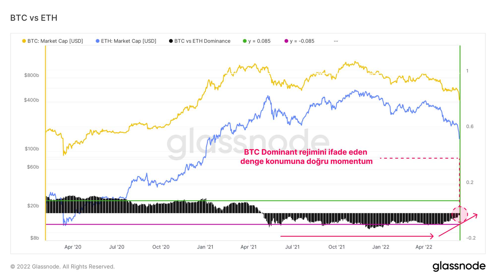 Ethereum dominansı, Kasım 2021 ATH'den bu yana kayda değer bir düşüş gösterdi ve tarihsel olarak daha uzun vadeli bir Bitcoin performans döneminden önce gelen bükülme noktasına yakın. Bu durum, ETH'nin BTC'nin altında performans gösterdiği ve her ikisinin de USD'nin altında performans gösterme eğiliminde olduğu piyasadaki genel riskten kaçınma duyarlılığının toplam durumunu vurgulamaktadır.