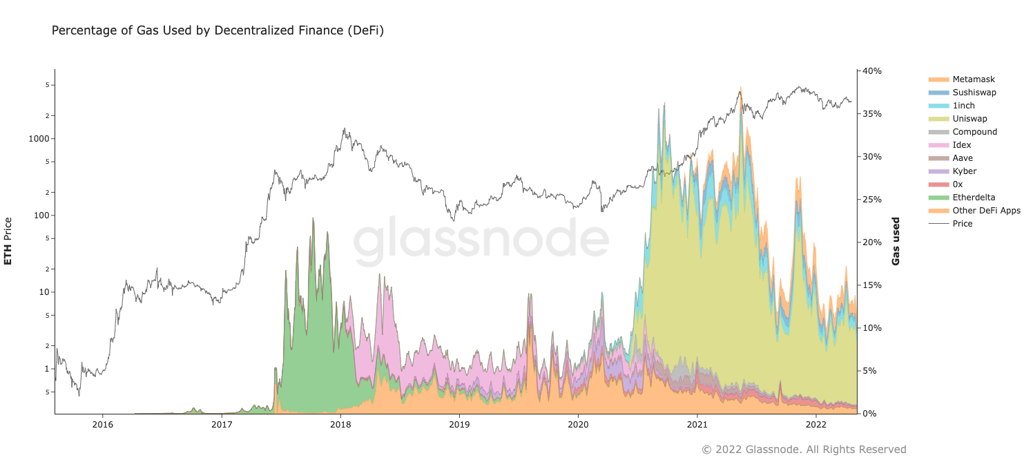 去中心化交易所(DEXs)随着2017年EtherDelta的出现而首次得到普及,此后一直是gas的主要消费者。由于流动性既由交易者提供,也是吸引他们的原因之一,因此有一种自然的中心化力量在起作用--在大多数时间点,只有一两个平台在这个类别中占主导地位, Uniswap目前处于领先地位(在DeFi的gas消费中达到88%的峰值,目前处于~60%)。还请注意Metamask(橙色,顶部区域),它不是直接的去中心化交易所,而是一个聚合器,使用其他供应商提供的特定货币对的 "最佳互换价格",从客户那里抽象出它们。这也是我们期望看到的另一个趋势--随着行业的成熟,一些功能可能变得隐性而非显性,用户与那些通过抽象化链上和跨链互动的所有细节而提供最大便利的平台进行互动。