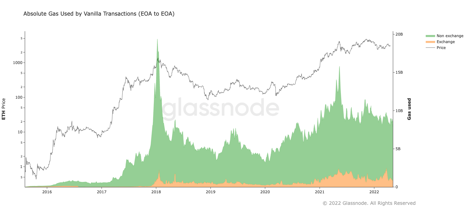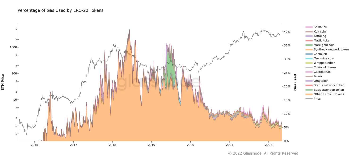 - Como o mercado de gás é muito competitivo, o gasto com gás é indicativo da demanda do usuário e do valor econômico atribuído pelos usuários a um caso de uso específico ou a um protocolo. Observe que a participação em declínio do gás ainda pode representar um aumento nos gastos em termos de fiat ou Ether e vice-versa - para isso, talvez seja necessário consultar os valores de taxa absoluta correspondentes no Glassnode Studio. Estamos nos concentrando apenas no compartilhamento de gás neste artigo, pois nosso objetivo é comparar a prevalência relativa de casos de uso no ecossistema Ethereum.