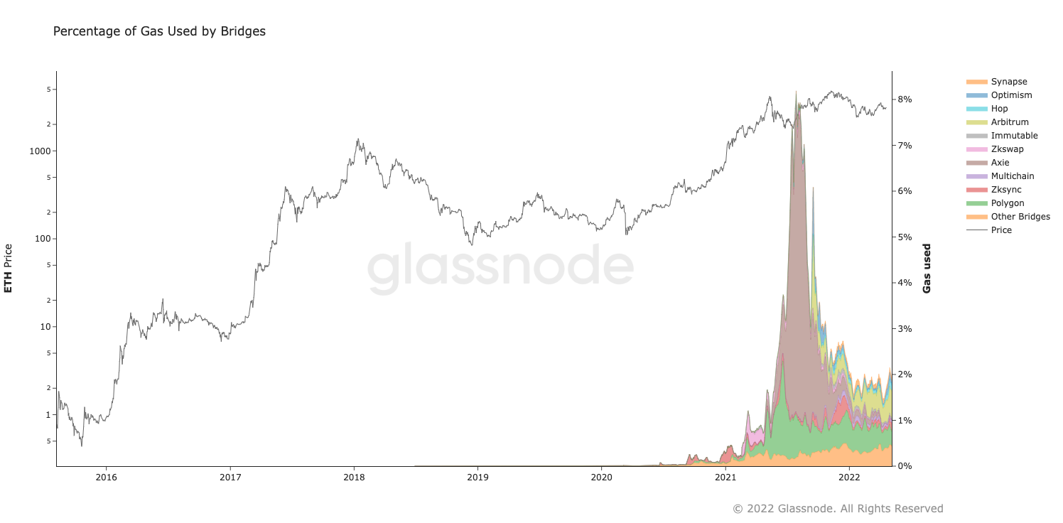 Falando em cross-chain, as bridges estão entre os mais novos consumidores notáveis de gás. À medida que as transações no Ethereum se tornam bastante caras em termos fiduciários, e as blockchains concorrentes amadurecem em termos de estabilidade e funcionalidade, vemos o surgimento de fluxos de capital entre cadeias. Além de um pico de curta duração da ponte Ronin no auge da popularidade do Axie Infinity (com um consumo de gás de ~8% por alguns dias), o consumo de gás das bridges dobrou no último ano (de 1% para 2%) , conectando a blockchain Ethereum a soluções L2 dentro do ecossistema (Polygon, Arbitrum, Optimism), bem como ecossistemas concorrentes (Avalanche, Polkadot). Podemos chegar a um ponto em que qualquer insight significativo sobre o fluxo de fundos pode exigir uma mentalidade e ferramentas de várias cadeias.