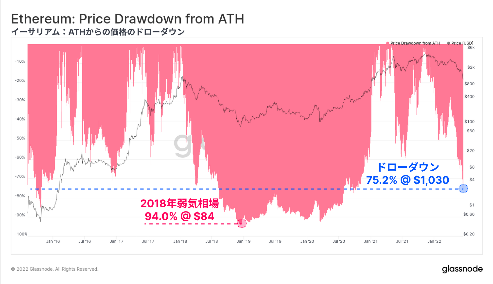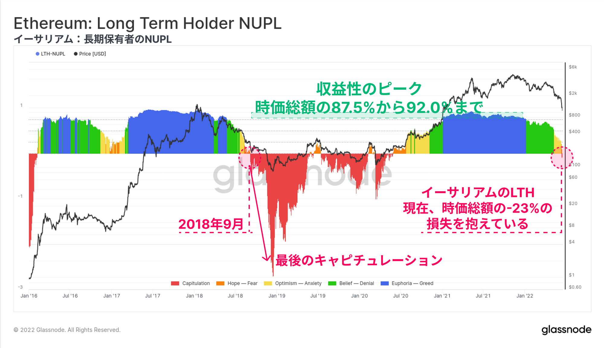 イーサリアムの保有者層は現在、HODLされたコインが持つ多額の未実現損失と、ここ数週間でロックされた歴史的に大きな損失で、確実に含み損状態になっている。これは、投資家にとって強い経済的苦痛が存在することを示しており、悲惨な状況である一方、2018年の弱気相場サイクルで見られた収益性と価格のドローダウンの極端な底値にはまだ達していない。