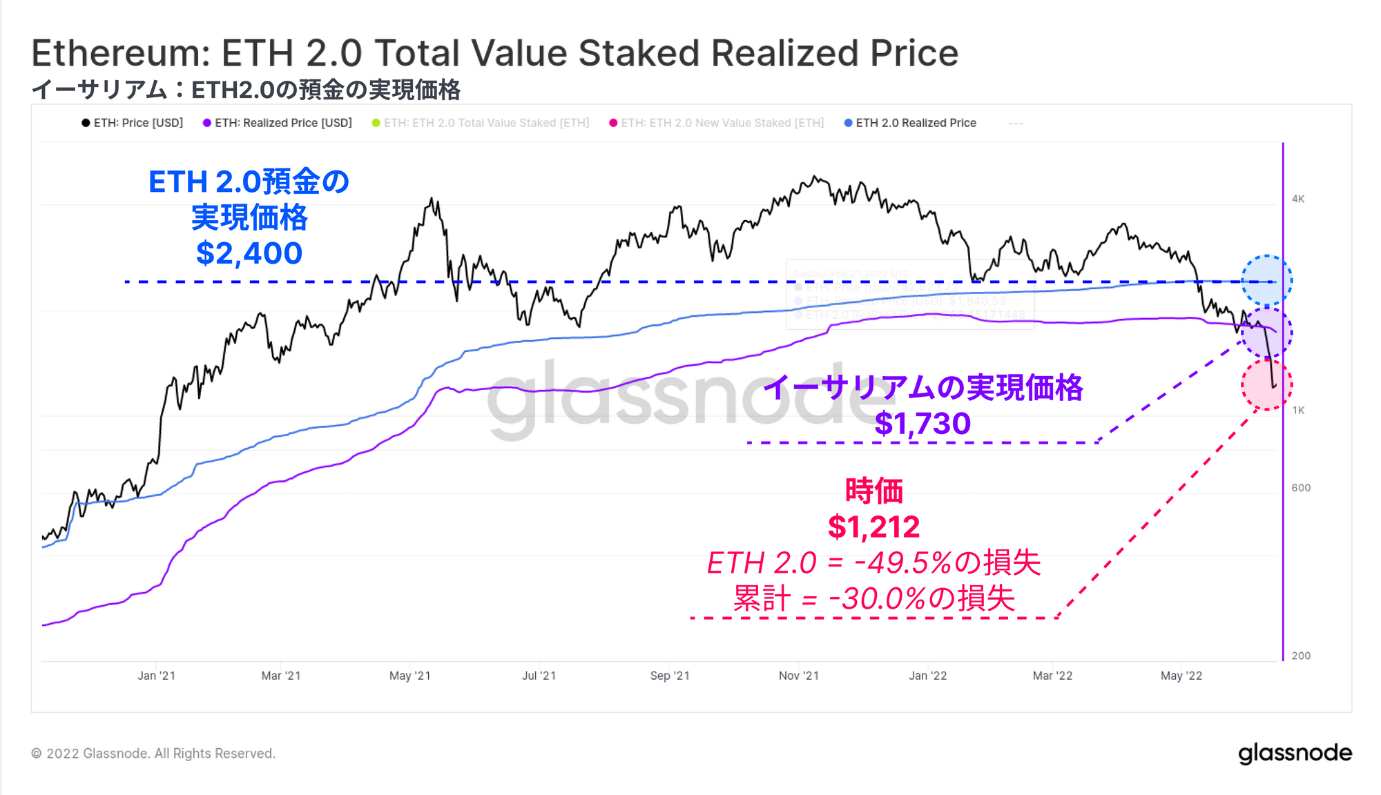 ETH 2.0預金者に注目すると、ETHトークンはステーキング状態を解除できないため、預け入れた時の価値を直接測定できる。この基準では、ETH 2.0預金者は$2,400とはるかに高い実現価格のコストベースを持っており、したがって平均で-49.5%の未実現損失を抱えていることになる。
