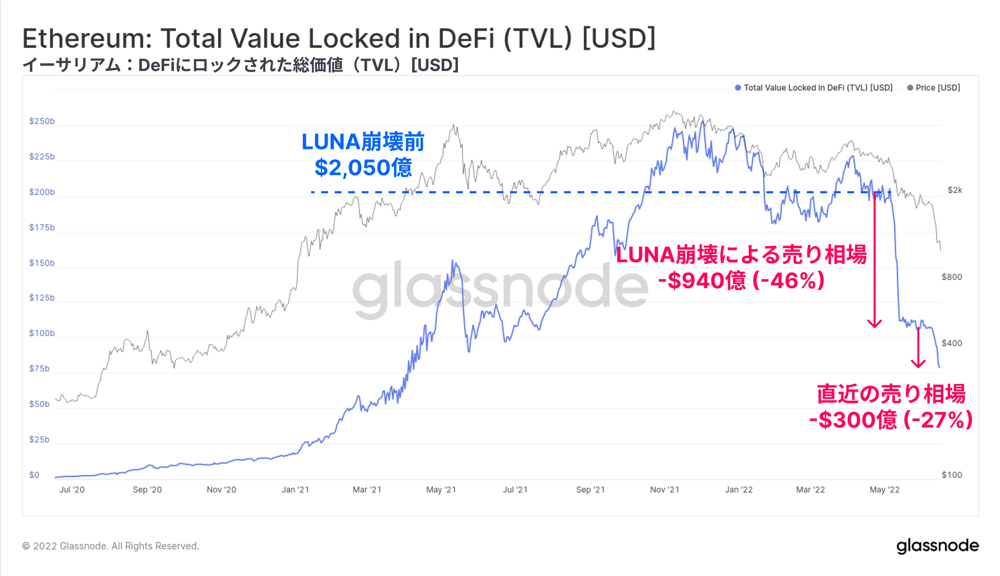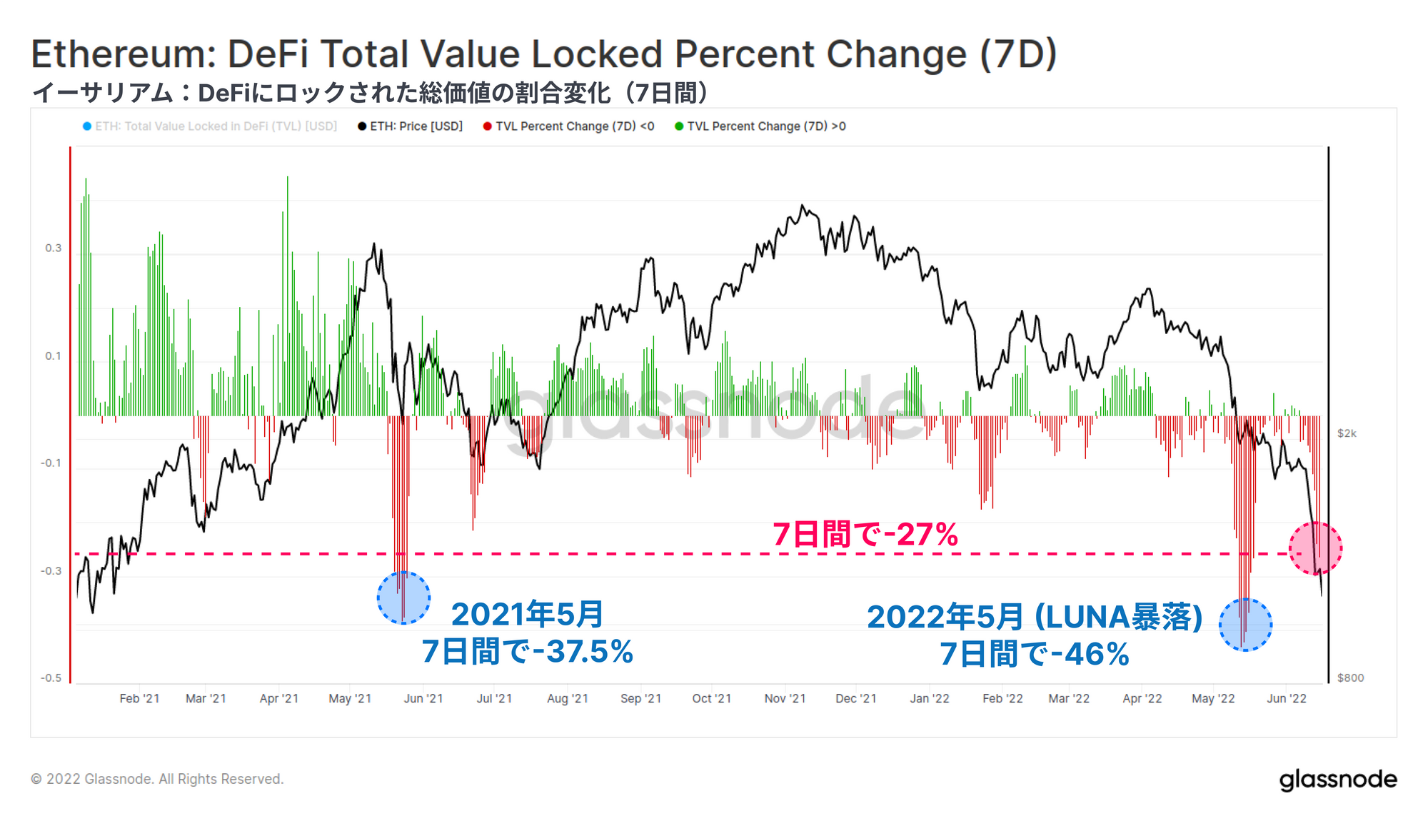 イーサリアムのTVLは、過去6週間で1,240億ドル(60%)減少し、TVL総額は810億ドルまで押し下げた。5月と6月を通じてポジションの解消は2回に分けて行われており、まずLUNAプロジェクトの崩壊時に-940億ドル、そして6月中旬にさらに-300億ドル分発生した。